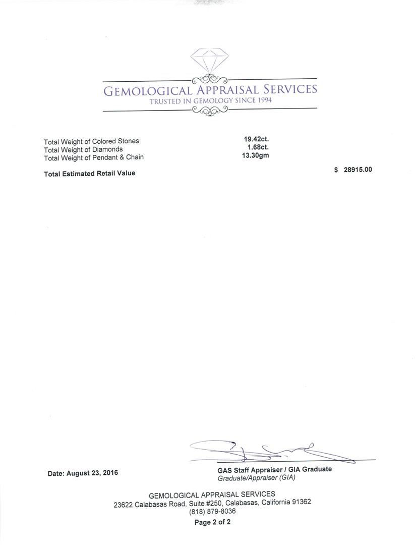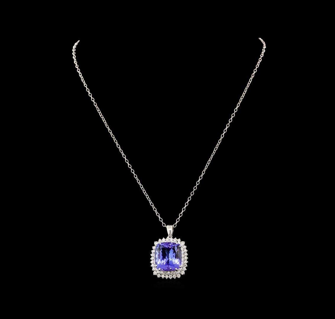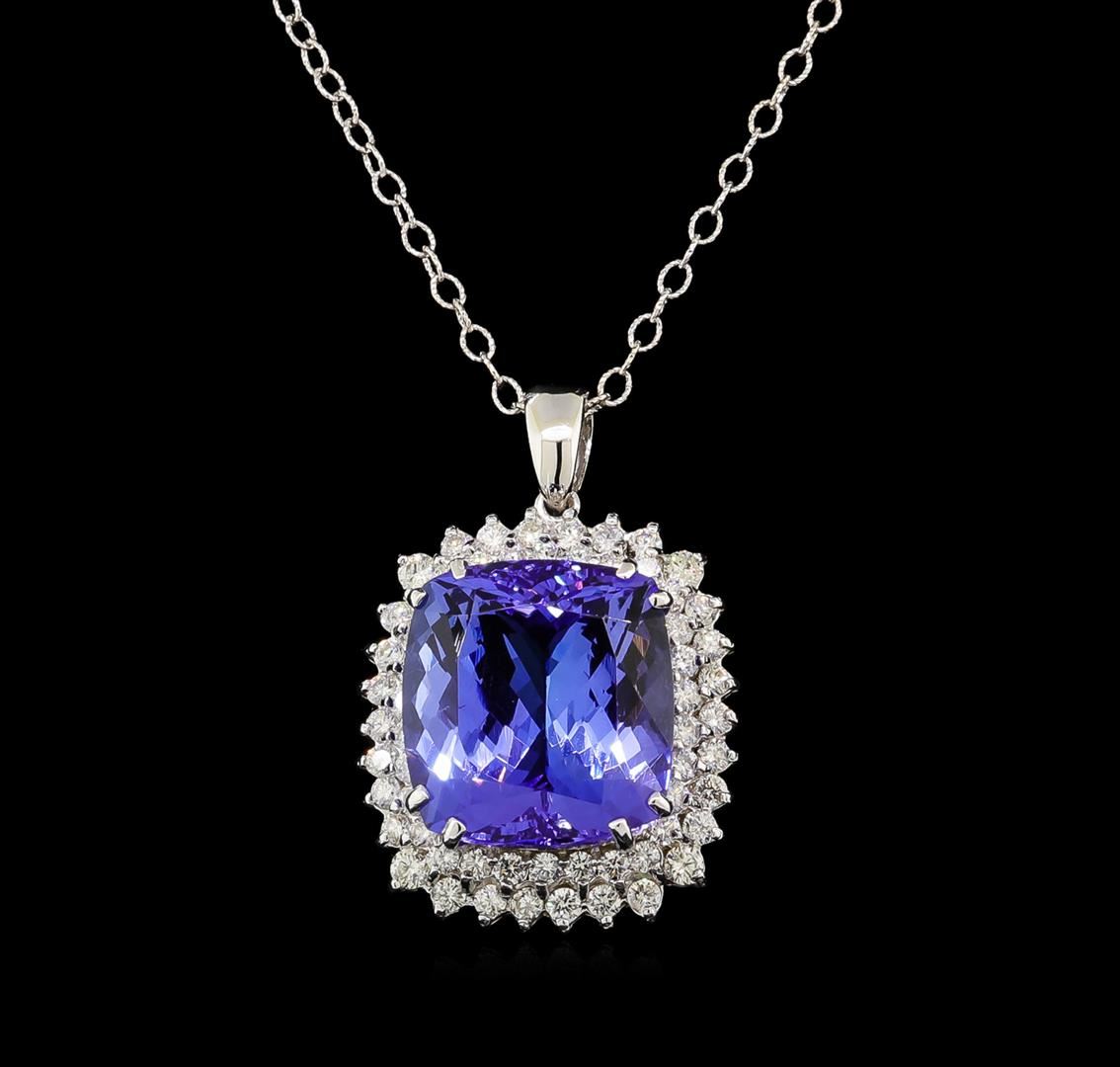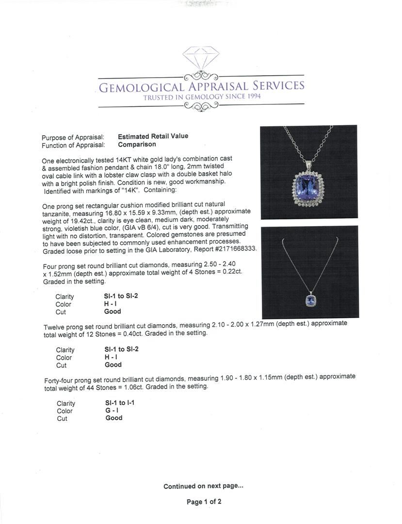One electronically tested 14KT white gold lady's combination cast & assembled fashion pendant & chain 18.0' long, 2mm twisted oval cable link with a lobster claw clasp with a double basket halo with a bright polish finish. Identified with markings of '14K'. Condition is new, good workmanship. Containing: One prong set rectangular cushion modified brilliant cut natural tanzanite, measuring 16.80 x 15.59 x 9.33mm, (depth est.) approximate weight of 19.42ct., clarity is eye clean, medium dark, moderately strong, violetish blue color, (GIA vB 6/4), cut is very good. Transmitting light with no distortion, transparent. Colored gemstones are presumed to have been subjected to commonly used enhancement processes. Graded loose prior to setting in the GIA Laboratory, Report #2171668333. Four prong set round brilliant cut diamonds, measuring 2.50 - 2.40 x 1.52mm (depth est.) approximate total weight of 4 Stones = 0.22ct. Graded in the setting. Clarity SI-1 to SI-2. Color: H - I Cut Good Twelve prong set round brilliant cut diamonds, measuring 2.10 - 2.00 x 1.27mm (depth est.) approximate total weight of 12 Stones = 0.40ct. Graded in the setting. Clarity SI-1 to SI-2. Color: H - I Cut Good Forty-Four prong set round brilliant cut diamonds, measuring 1.90 - 1.80 x 1.15mm (depth est.) approximate total weight of 44 Stones = 1.06ct. Graded in the setting. Clarity SI-1 to I-1. Color: G - I Cut Good. Total Weight of Colored Stones 19.42ct.. Total Weight of Diamonds 1.68ct.. Total Weight of Pendant & Chain 13.30gm. GAS Appraised at $28,915.00.