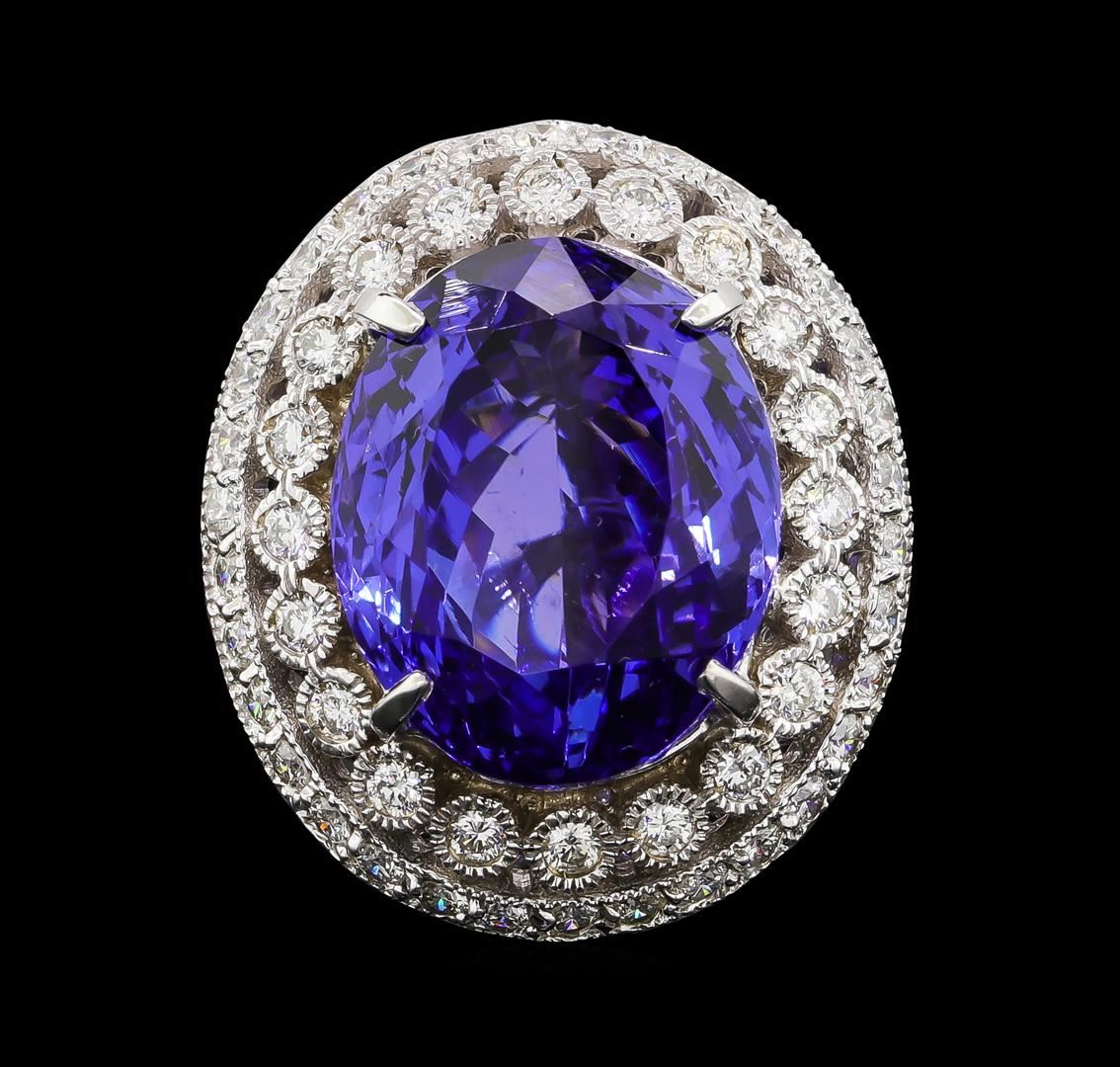 One electronically tested 14KT white gold lady's cast fashion ring with a double basket halo with a bright polish with milgrain detailing finish. The featured lady's ring has a shank measuring 3.38 millimeters wide. Identified with markings of 'K14'. Condition is new, good workmanship. Containing: One prong set oval modified brilliant cut natural tanzanite, measuring 17.75 x 14.37 x 10.44mm, (depth est.) 6%. bulge factor, approximate weight of 19.95ct., clarity is eye clean, medium dark, strong, violetish blue color, (GIA vB 6/5), cut is very good. Transmitting light with no distortion, transparent. Colored gemstones are presumed to have been subjected to commonly used enhancement processes. Graded loose prior to setting in the GIA Laboratory, Report #6177847683. Twenty-Six bezel set round brilliant cut diamonds, measuring 2.10 - 2.00 x 1.25mm (depth est.) approximate total weight of 26 Stones = 0.83ct. Graded in the setting. Clarity SI-1 to SI-2. Color: H - I Cut Good Thirty-Four prong set round brilliant cut diamonds, measuring 1.90 - 1.85 x 1.13mm (depth est.) approximate total weight of 34 Stones = 0.82ct. Graded in the setting. Clarity SI-1 to SI-2. Color: H - I Cut Good. Total Weight of Colored Stones 19.95ct.. Total Weight of Diamonds 1.65ct.. Total Weight of Ring 15.70gm. GAS Appraised at $30,390.00.