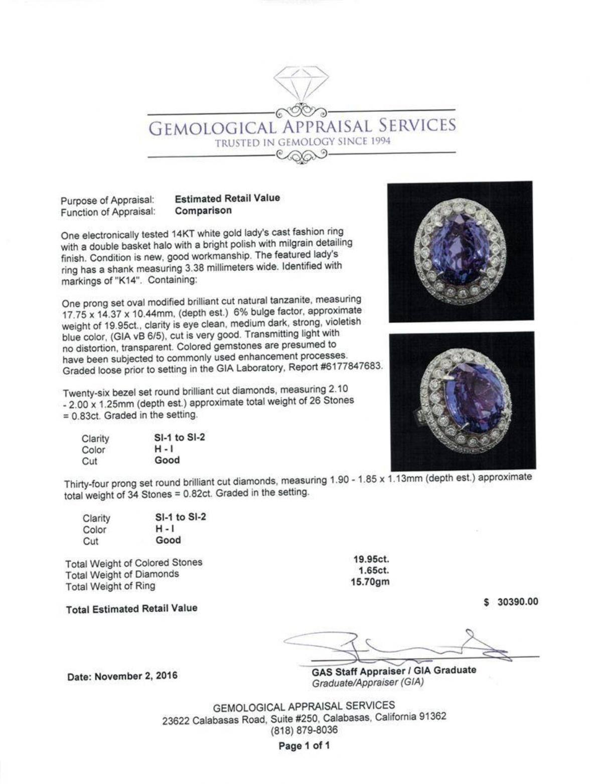 One electronically tested 14KT white gold lady's cast fashion ring with a double basket halo with a bright polish with milgrain detailing finish. The featured lady's ring has a shank measuring 3.38 millimeters wide. Identified with markings of 'K14'. Condition is new, good workmanship. Containing: One prong set oval modified brilliant cut natural tanzanite, measuring 17.75 x 14.37 x 10.44mm, (depth est.) 6%. bulge factor, approximate weight of 19.95ct., clarity is eye clean, medium dark, strong, violetish blue color, (GIA vB 6/5), cut is very good. Transmitting light with no distortion, transparent. Colored gemstones are presumed to have been subjected to commonly used enhancement processes. Graded loose prior to setting in the GIA Laboratory, Report #6177847683. Twenty-Six bezel set round brilliant cut diamonds, measuring 2.10 - 2.00 x 1.25mm (depth est.) approximate total weight of 26 Stones = 0.83ct. Graded in the setting. Clarity SI-1 to SI-2. Color: H - I Cut Good Thirty-Four prong set round brilliant cut diamonds, measuring 1.90 - 1.85 x 1.13mm (depth est.) approximate total weight of 34 Stones = 0.82ct. Graded in the setting. Clarity SI-1 to SI-2. Color: H - I Cut Good. Total Weight of Colored Stones 19.95ct.. Total Weight of Diamonds 1.65ct.. Total Weight of Ring 15.70gm. GAS Appraised.