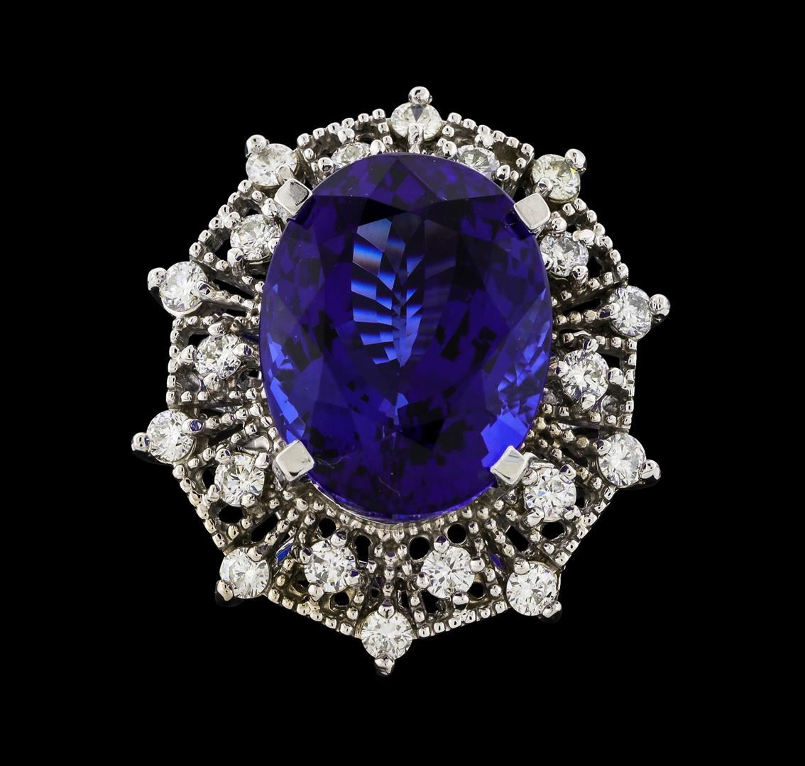 One electronically tested 14KT white gold lady's cast fashion ring with a double basket halo with a bright polish with milgrain detailing finish. The featured lady's ring has a shank measuring 2.99 millimeters wide. Identified with markings of 'K14'. Condition is new, good workmanship. Containing: One prong set oval modified brilliant cut natural tanzanite, measuring 18.53 x 14.11 x 10.59mm, (depth est.) 2%. bulge factor, approximate weight of 19.97ct., clarity is eye clean, dark, strong, violetish blue color, (GIA vB 7/5), cut is very good. Transmitting light with no distortion, transparent. Colored gemstones are presumed to have been subjected to commonly used enhancement processes. Graded loose prior to setting in the GIA Laboratory, Report #5171847680. Twenty prong set round brilliant cut diamonds, measuring 2.60 - 2.50 x 1.58mm (depth est.) approximate total weight of 20 Stones = 1.24ct. Graded in the setting. Clarity SI-1 to I-1. Color: H - I Cut Good. Total Weight of Colored Stones 19.97ct.. Total Weight of Diamonds 1.24ct.. Total Weight of Ring 13.50gm. GAS Appraised at $29,265.00.