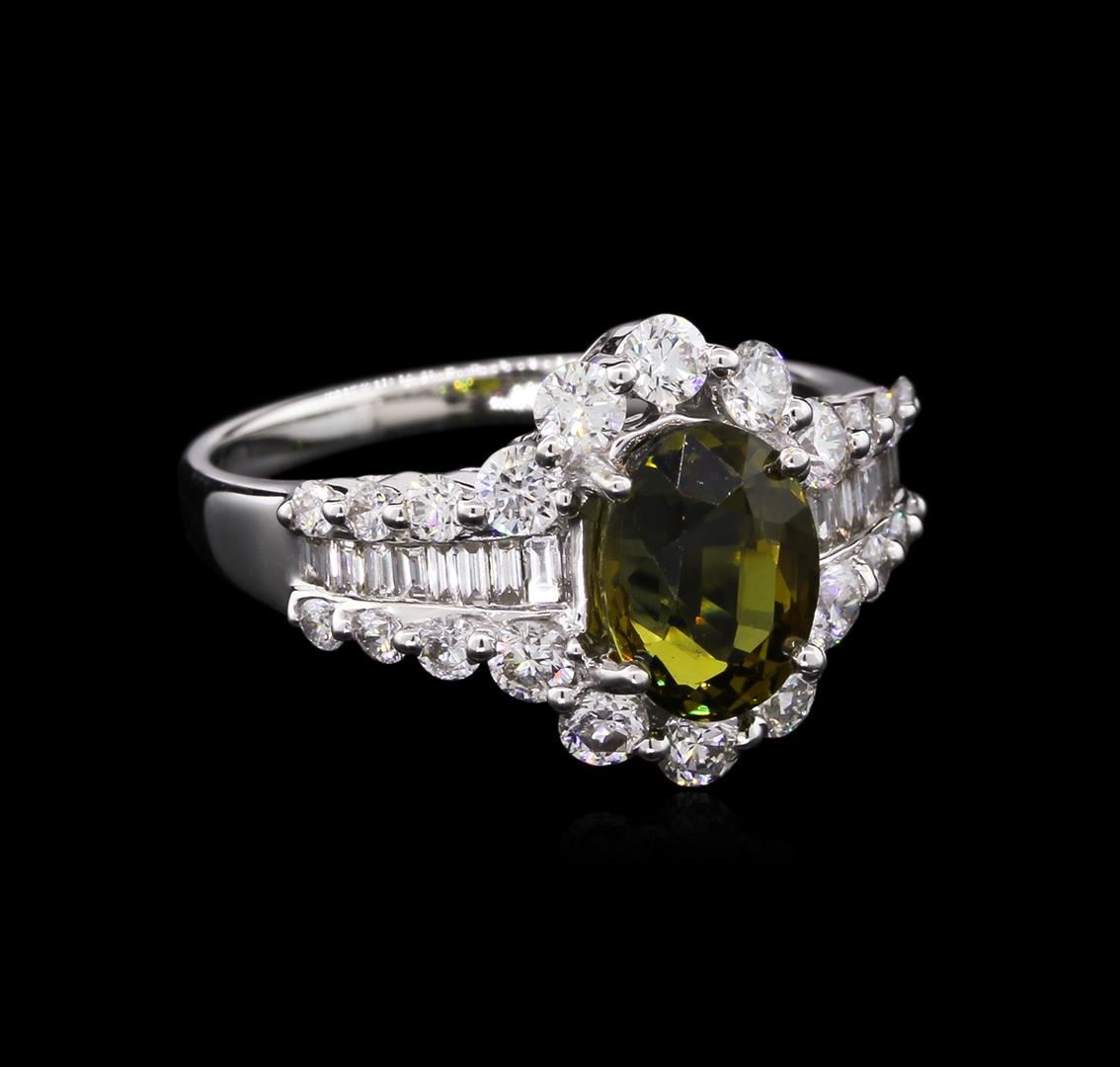 One electronically tested 18KT white gold ladies cast alexandrite and diamond ring with a bright polish finish. The featured alexandrite is set within mirroring diamond ribbons supported by diamond set shoulders, completed by a one and one-half millimeter wide band. Identified with markings of "18K 750". Condition is new, good workmanship. Containing: One prong set oval mixed cut natural alexandrite, measuring 8.24 x 6.18 x 4.67mm, exact weight 2.05ct., type II Clarity is eye clean, medium dark, very slightly grayish, yellowish green color, (GIA yG 6/3) to medium dark, very slightly brownish, brownish yellow, (GIA brY 6/3), cut is good. Transmitting light with no distortion, transparent. GIA Gemological Report attached. Graded loose prior to setting in the GIA Laboratory, Report #62053322069.The yellowish green color was photographed under 6000K daylight; the brownish yellow color was photographed under 2000K incandescent light, see the photographs to the right. Alexandrite was discovered in the 1830's near the Tokovaya River in the Ural Mountains of Siberian Russia. It later became the national gemstone of Russia. The name "alexandrite" became official in 1842.Alexandrite is a variety of chrysoberyl. It contains both beryllium and chromium. It is the chromium that accounts for the spectacular color change. The color change is the primary qualification for a chrysoberyl to be considered alexandrite. Alexandrite is strongly trichroic. Its color change results in a near-equal transmission of the blue-green and red portions of the spectrum, coupled with strong absorption in the yellow. Today Alexandrite is found in Brazil, India, Madagascar, Myanmar, Russia, Sri Lanka, Tanzania and Zimbabwe. Thirty-Eight prong & channel set round brilliant & baguette cut diamonds approximate total weight of 38 Stones = 1.01ct. Graded in the setting. Clarity: VS-2 to SI-2. Color: F - H. Total Weight of Colored Stones 2.05ct. Total Weight of Diamonds 1.01ct. Total Weight of Ring 4.62gm. AIG Appraised at $15,865.00.