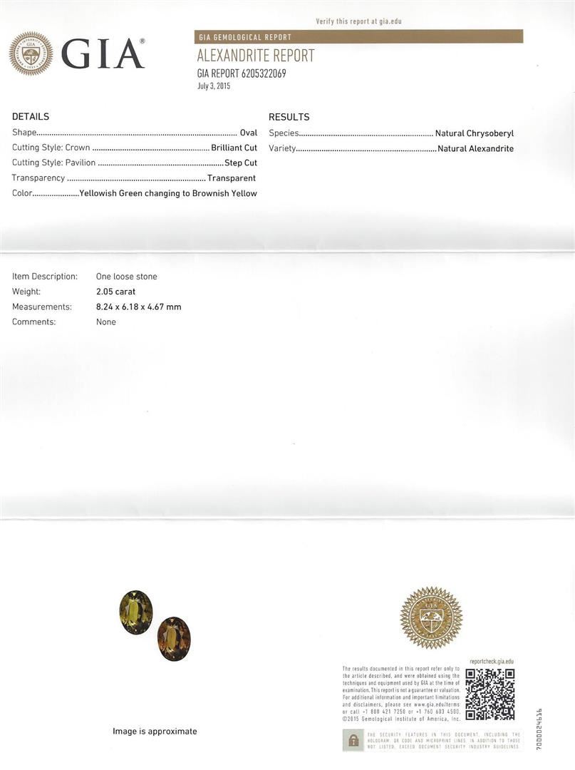 One electronically tested 18KT white gold ladies cast alexandrite and diamond ring with a bright polish finish. The featured alexandrite is set within mirroring diamond ribbons supported by diamond set shoulders, completed by a one and one-half millimeter wide band. Identified with markings of "18K 750". Condition is new, good workmanship. Containing: One prong set oval mixed cut natural alexandrite, measuring 8.24 x 6.18 x 4.67mm, exact weight 2.05ct., type II Clarity is eye clean, medium dark, very slightly grayish, yellowish green color, (GIA yG 6/3) to medium dark, very slightly brownish, brownish yellow, (GIA brY 6/3), cut is good. Transmitting light with no distortion, transparent. GIA Gemological Report attached. Graded loose prior to setting in the GIA Laboratory, Report #62053322069.The yellowish green color was photographed under 6000K daylight; the brownish yellow color was photographed under 2000K incandescent light, see the photographs to the right. Alexandrite was discovered in the 1830's near the Tokovaya River in the Ural Mountains of Siberian Russia. It later became the national gemstone of Russia. The name "alexandrite" became official in 1842.Alexandrite is a variety of chrysoberyl. It contains both beryllium and chromium. It is the chromium that accounts for the spectacular color change. The color change is the primary qualification for a chrysoberyl to be considered alexandrite. Alexandrite is strongly trichroic. Its color change results in a near-equal transmission of the blue-green and red portions of the spectrum, coupled with strong absorption in the yellow. Today Alexandrite is found in Brazil, India, Madagascar, Myanmar, Russia, Sri Lanka, Tanzania and Zimbabwe. Thirty-Eight prong & channel set round brilliant & baguette cut diamonds approximate total weight of 38 Stones = 1.01ct. Graded in the setting. Clarity: VS-2 to SI-2. Color: F - H. Total Weight of Colored Stones 2.05ct. Total Weight of Diamonds 1.01ct. Total Weight of Ring 4.62gm. AIG Appraised at $15,865.00.