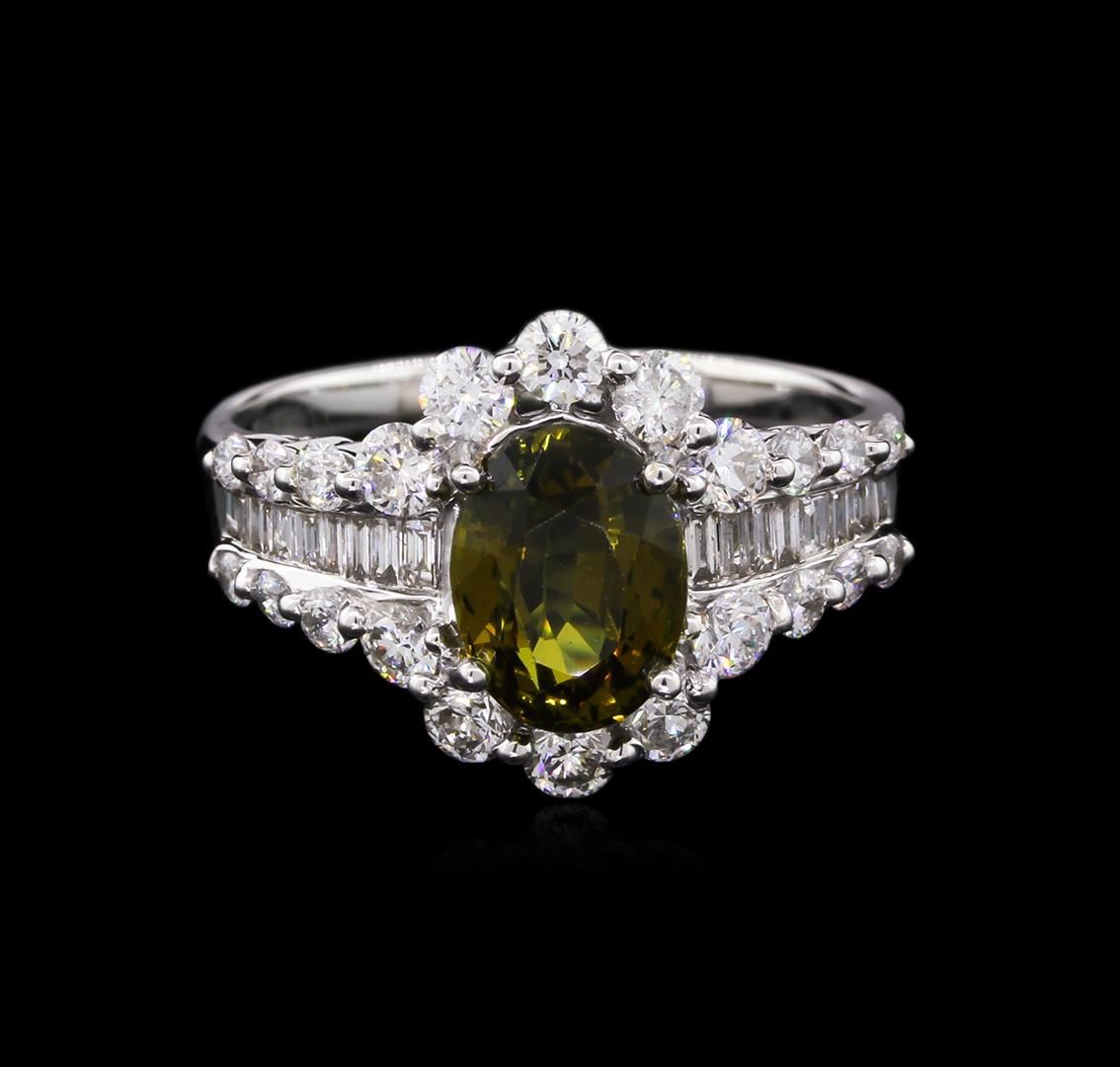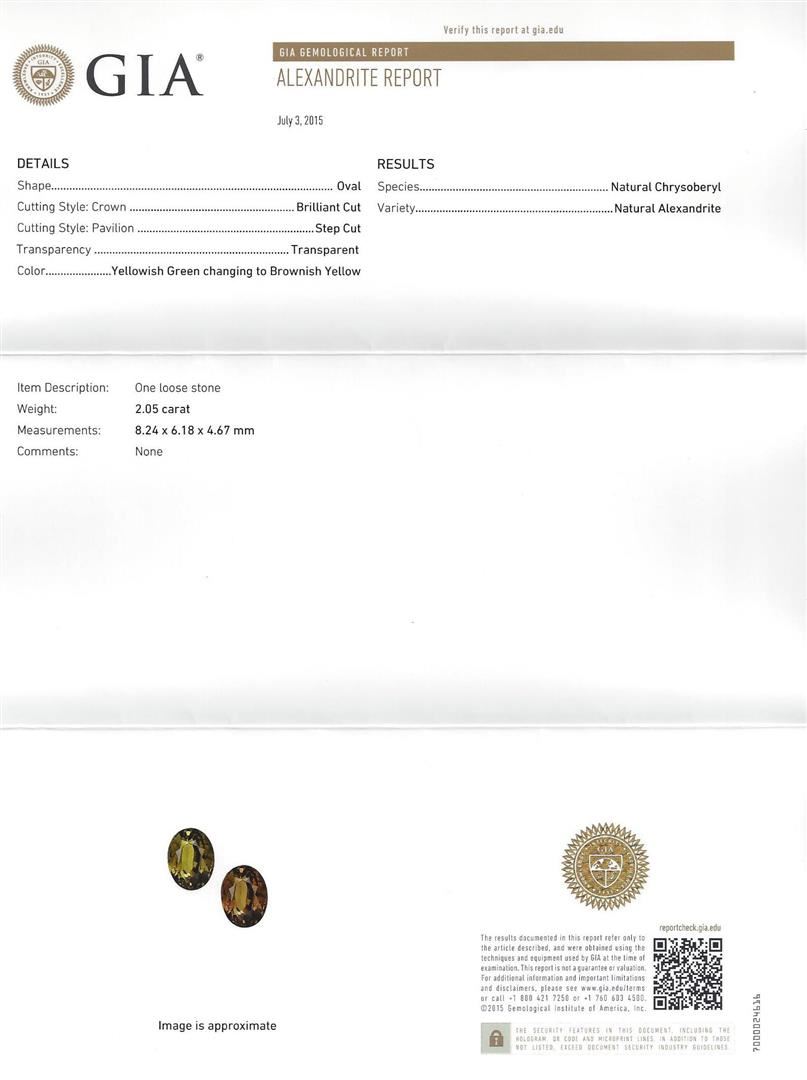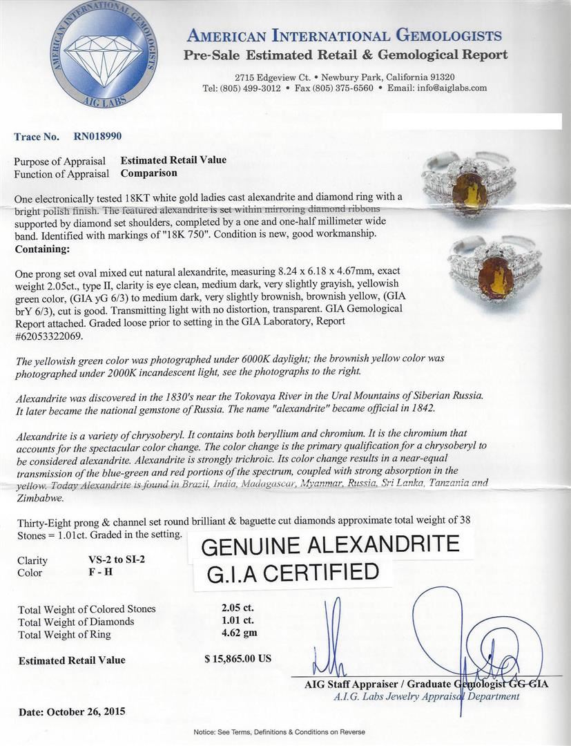 One electronically tested 18KT white gold ladies cast alexandrite and diamond ring with a bright polish finish. The featured alexandrite is set within mirroring diamond ribbons supported by diamond set shoulders, completed by a one and one-half millimeter wide band. Identified with markings of "18K 750". Condition is new, good workmanship. Containing: One prong set oval mixed cut natural alexandrite, measuring 8.24 x 6.18 x 4.67mm, exact weight 2.05ct., type II Clarity is eye clean, medium dark, very slightly grayish, yellowish green color, (GIA yG 6/3) to medium dark, very slightly brownish, brownish yellow, (GIA brY 6/3), cut is good. Transmitting light with no distortion, transparent. GIA Gemological Report attached. Graded loose prior to setting in the GIA Laboratory, Report #62053322069.The yellowish green color was photographed under 6000K daylight; the brownish yellow color was photographed under 2000K incandescent light, see the photographs to the right. Alexandrite was discovered in the 1830's near the Tokovaya River in the Ural Mountains of Siberian Russia. It later became the national gemstone of Russia. The name "alexandrite" became official in 1842.Alexandrite is a variety of chrysoberyl. It contains both beryllium and chromium. It is the chromium that accounts for the spectacular color change. The color change is the primary qualification for a chrysoberyl to be considered alexandrite. Alexandrite is strongly trichroic. Its color change results in a near-equal transmission of the blue-green and red portions of the spectrum, coupled with strong absorption in the yellow. Today Alexandrite is found in Brazil, India, Madagascar, Myanmar, Russia, Sri Lanka, Tanzania and Zimbabwe. Thirty-Eight prong & channel set round brilliant & baguette cut diamonds approximate total weight of 38 Stones = 1.01ct. Graded in the setting. Clarity: VS-2 to SI-2. Color: F - H. Total Weight of Colored Stones 2.05ct. Total Weight of Diamonds 1.01ct. Total Weight of Ring 4.62gm. AIG Appraised at $15,865.00.