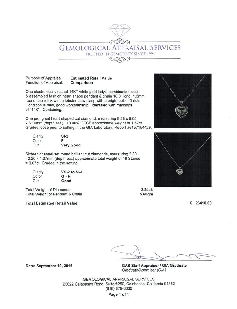 One electronically tested 14KT white gold lady's combination cast & assembled fashion heart shape pendant & chain 18.0' long, 1.3mm round cable link with a lobster claw clasp with a bright polish finish. Identified with markings of '14K'. Condition is new, good workmanship. Containing: One prong set heart shaped cut diamond, measuring 8.28 x 9.05 x 3.16mm (depth est.) , 10.00.%. GTCF approximate weight of 1.57ct. Graded loose prior to setting in the GIA Laboratory, Report #6157154429. Clarity SI-2. Color: F Cut Very Good Sixteen channel set round brilliant cut diamonds, measuring 2.30 - 2.20 x 1.37mm (depth est.) approximate total weight of 16 Stones = 0.67ct. Graded in the setting. Clarity VS-2 to SI-1. Color: G - H Cut Good. Total Weight of Diamonds 2.24ct.. Total Weight of Pendant & Chain 5.60gm. GAS Appraised at $26,410.00.
