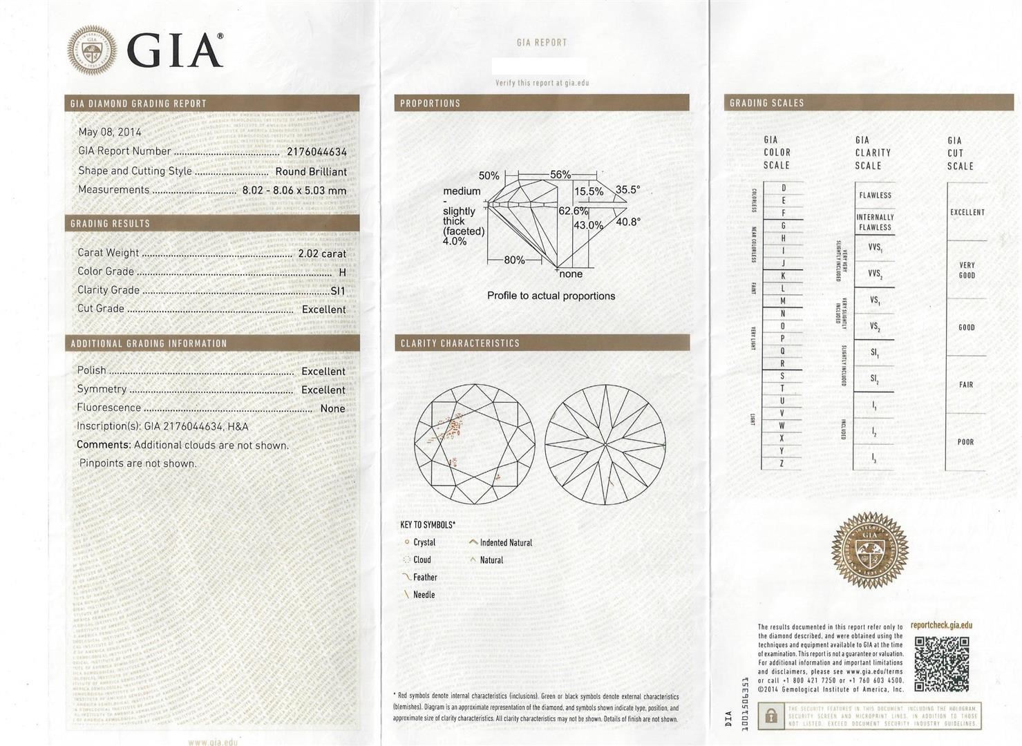 One electronically tested 14KT white gold lady's combination cast & assembled straight line wedding ring with a bright polish finish. Condition is new, good workmanship. The featured ladies ring has a shank measuring 1.93 millimeters in width. Identified with markings of 14K. Containing: One prong set round brilliant cut diamond, measuring 8.02 - 8.06 x 5.03mm (depth est.) approximate weight of 2.02ct. Graded loose prior to setting in the GIA Laboratory, Report # 2176044634. The featured diamond has a girdle inscription: GIA 2176044634, H&A. Clarity: SI-1. Color: H. Cut: Ideal. Twenty-six prong set round brilliant cut diamonds, measuring 1.80 - 1.75 x 1.07mm (depth est.) approximate total weight of 26 Stones = 0.53ct. Graded in the setting. Clarity: VS-1 to SI-1. Color: G - H. Cut: Excellent. Total Weight of Diamonds 2.55ct. Total Weight of Wedding Ring 3.30 grams. GAS Appraised at $63,465.00.