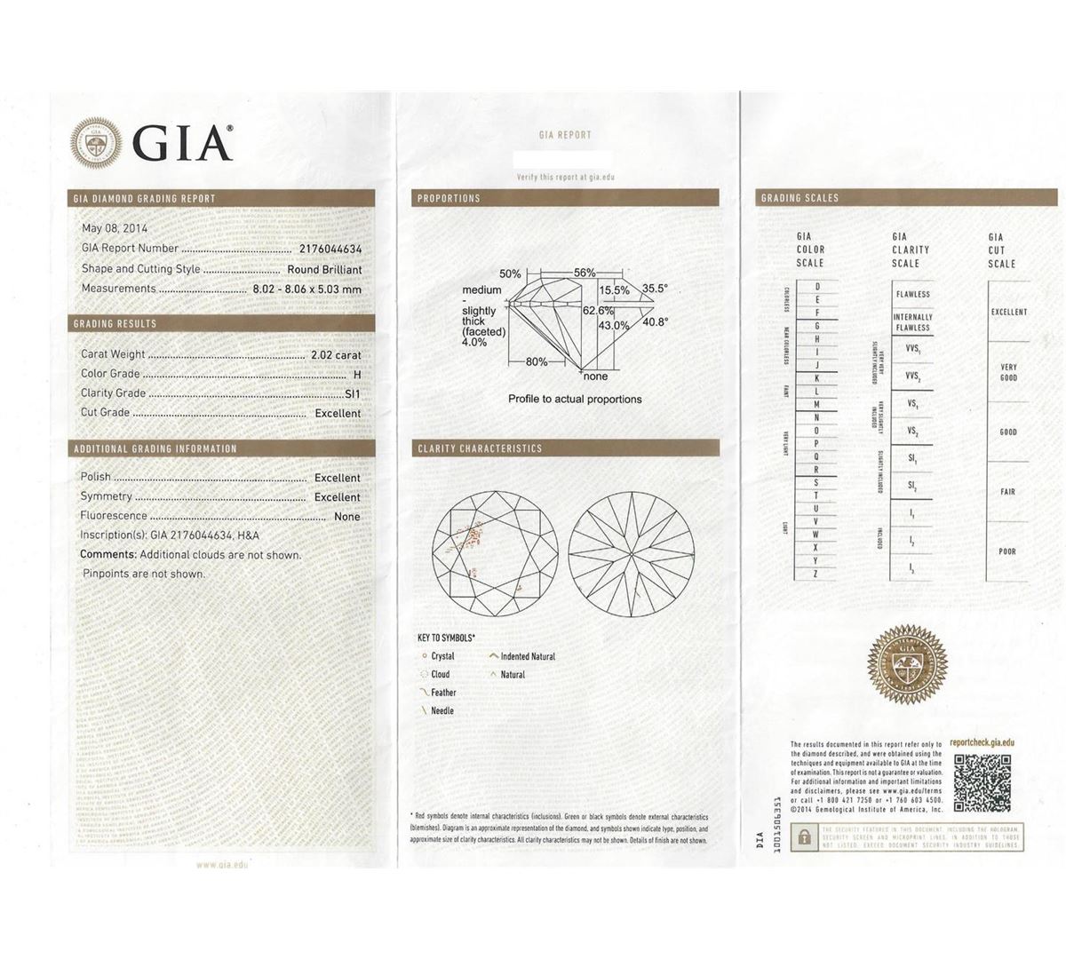 One electronically tested 14KT white gold lady's combination cast & assembled straight line wedding ring with a bright polish finish. Condition is new, good workmanship. The featured ladies ring has a shank measuring 1.93 millimeters in width. Identified with markings of 14K. Containing: One prong set round brilliant cut diamond, measuring 8.02 - 8.06 x 5.03mm (depth est.) approximate weight of 2.02ct. Graded loose prior to setting in the GIA Laboratory, Report # 2176044634. The featured diamond has a girdle inscription: GIA 2176044634, H&A. Clarity: SI-1. Color: H. Cut: Ideal. Twenty-six prong set round brilliant cut diamonds, measuring 1.80 - 1.75 x 1.07mm (depth est.) approximate total weight of 26 Stones = 0.53ct. Graded in the setting. Clarity: VS-1 to SI-1. Color: G - H. Cut: Excellent. Total Weight of Diamonds 2.55ct. Total Weight of Wedding Ring 3.30 grams. GAS Appraised at $63,465.00.