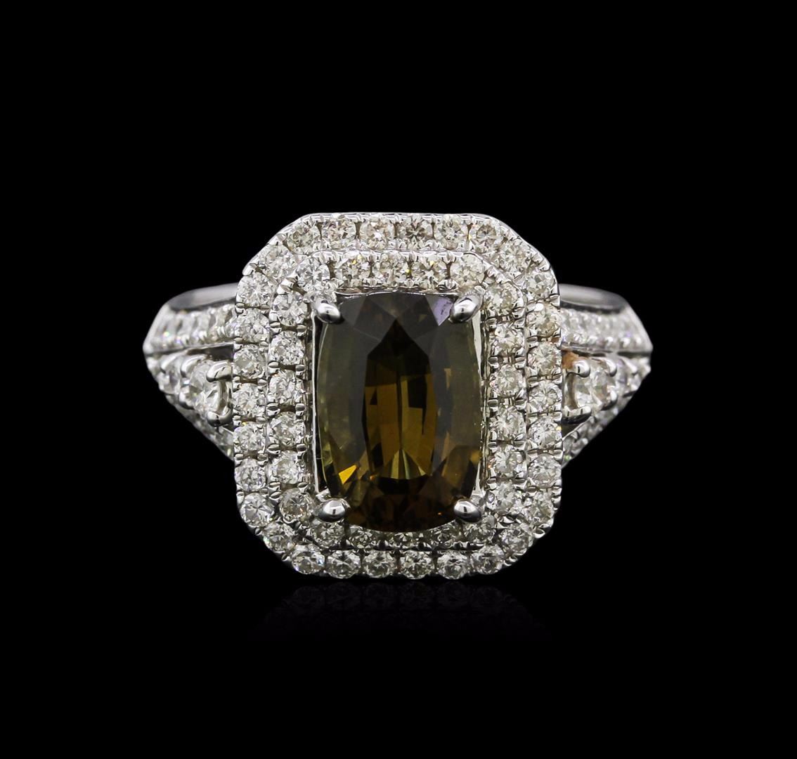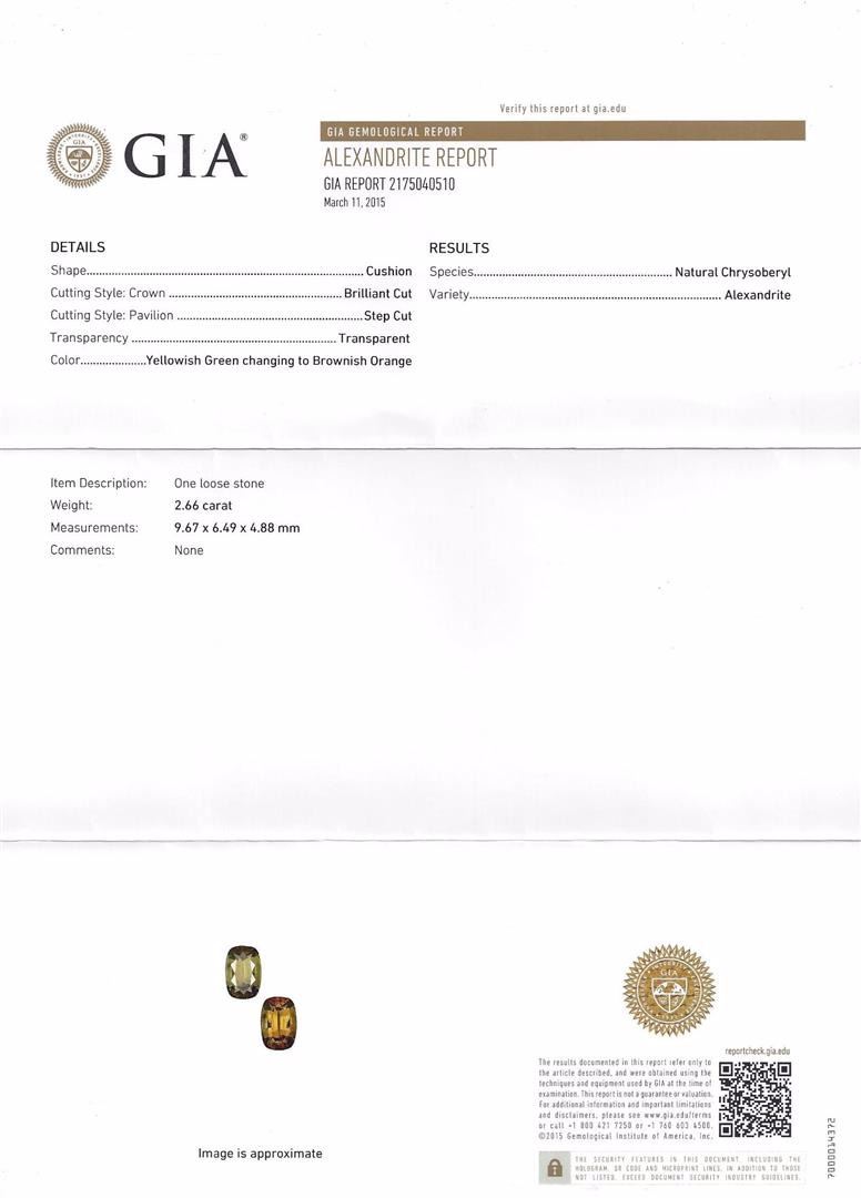 One electronically tested 18KT white gold ladies cast alexandrite and diamond ring with a bright polish finish. Condition is new, good workmanship. The featured alexandrite is set within a tiered diamond bezel supported by diamond set shoulders, completed by a two and one-half millimeter wide band. Trademark is HANA. Identified with markings of "18K". Containing: One prong set cushion mixed cut alexandrite, measuring 9.67 x 6.49 x 4.88mm, exact weight 2.66ct., type II, clarity is eye clean, medium dark, very slightly grayish, yellowish green color, (GIA yG 6/3) to medium dark, very slightly brownish, brownish orange, (GIA brO 6/3), cut is good. Transmitting light with no distortion, transparent. GIA Gemological Report attached. Graded loose prior to setting in the GIA Laboratory. The yellowish green color was photographed under 6000K daylight; the brownish orange colo was photographed under 2000K incandescent light, see the photographs to the right. Alexandrite was discovered in the 1830's near the Tokovaya River in the Ural Mountains of Siberian Russia. It later became the national gemstone of Russia. The name "alexandrite" became official in 1842. Alexandrite is a variety of chrysoberyl. It contains both beryllium and chromium. It is the chromium that accounts for the spectacular color change. The color change is the primary qualification for a chrysoberyl to be considered alexandrite. Alexandrite is strongly trichroic. Its color change results in a near-equal transmission of the blue-green and red portions of the spectrum, coupled with strong absorption in the yellow. Today Alexandrite is round in Brazil, India, Madagascar, Myanmar, Russia, Sri Lanka, Tanzania and Zimbabwe. The ring also contains eighty-two prong set round brilliant cut diamonds approximate total weight of 82 Stones = 1.07ct. Graded in the setting. Clarity: VS-2 to SI-2. Color: G - I. Total Weight of Colored Stones: 2.66ct. Total Weight of Diamonds: 1.07ct. Total Weight of Ring: 6.81 grams. AIG Appraised at $20,685.00.