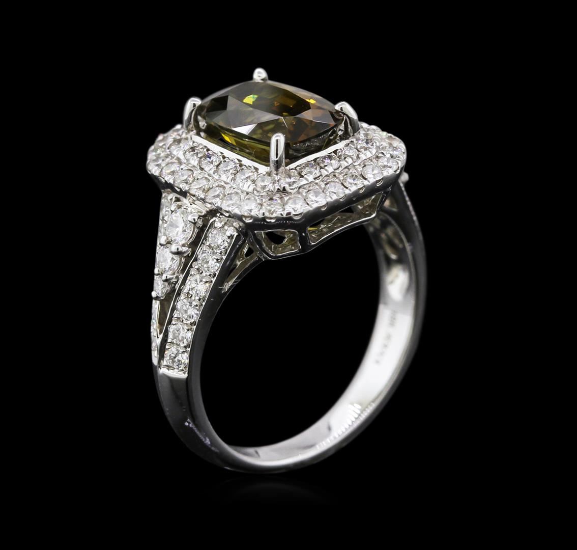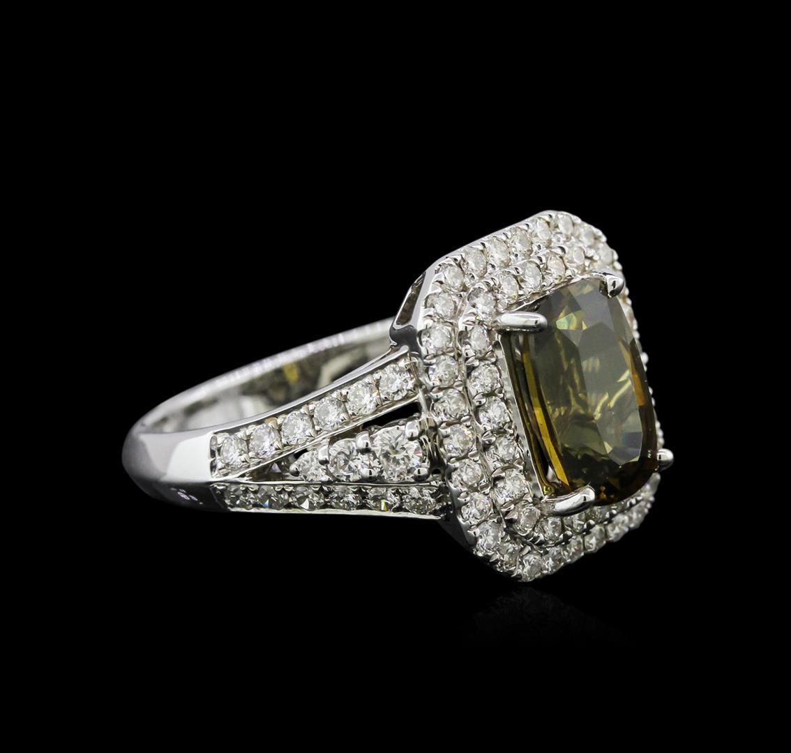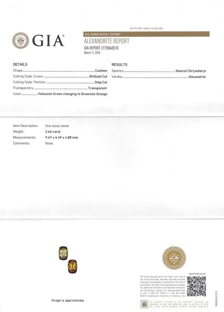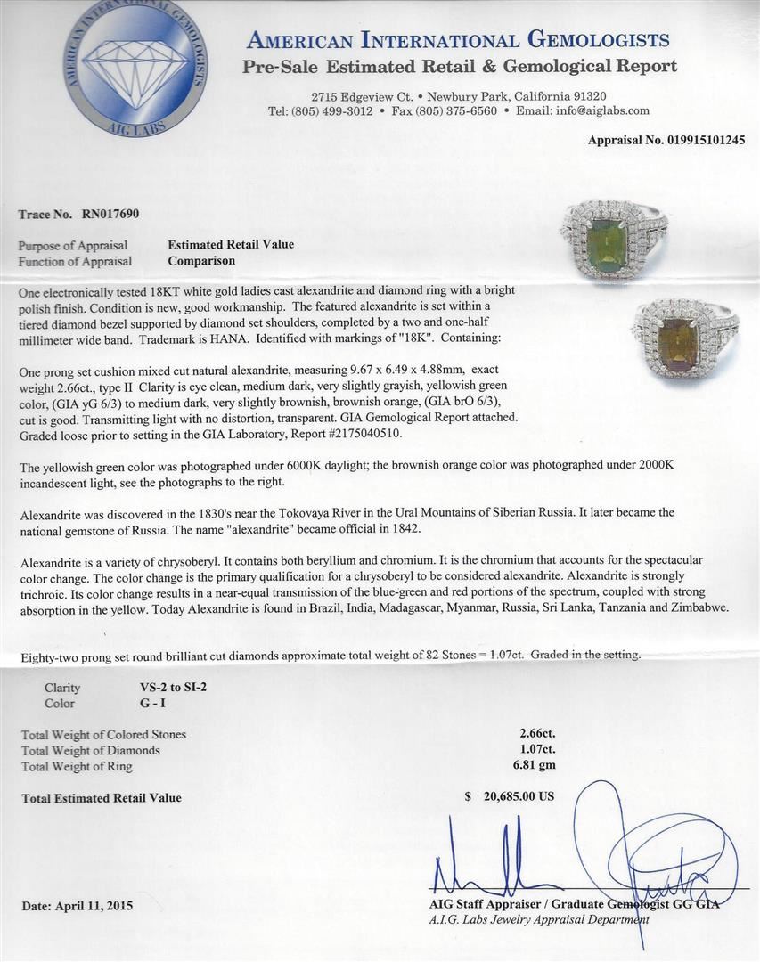 One electronically tested 18KT white gold ladies cast alexandrite and diamond ring with a bright polish finish. Condition is new, good workmanship. The featured alexandrite is set within a tiered diamond bezel supported by diamond set shoulders, completed by a two and one-half millimeter wide band. Trademark is HANA. Identified with markings of "18K". Containing: One prong set cushion mixed cut alexandrite, measuring 9.67 x 6.49 x 4.88mm, exact weight 2.66ct., type II, clarity is eye clean, medium dark, very slightly grayish, yellowish green color, (GIA yG 6/3) to medium dark, very slightly brownish, brownish orange, (GIA brO 6/3), cut is good. Transmitting light with no distortion, transparent. GIA Gemological Report attached. Graded loose prior to setting in the GIA Laboratory. The yellowish green color was photographed under 6000K daylight; the brownish orange colo was photographed under 2000K incandescent light, see the photographs to the right. Alexandrite was discovered in the 1830's near the Tokovaya River in the Ural Mountains of Siberian Russia. It later became the national gemstone of Russia. The name "alexandrite" became official in 1842. Alexandrite is a variety of chrysoberyl. It contains both beryllium and chromium. It is the chromium that accounts for the spectacular color change. The color change is the primary qualification for a chrysoberyl to be considered alexandrite. Alexandrite is strongly trichroic. Its color change results in a near-equal transmission of the blue-green and red portions of the spectrum, coupled with strong absorption in the yellow. Today Alexandrite is round in Brazil, India, Madagascar, Myanmar, Russia, Sri Lanka, Tanzania and Zimbabwe. The ring also contains eighty-two prong set round brilliant cut diamonds approximate total weight of 82 Stones = 1.07ct. Graded in the setting. Clarity: VS-2 to SI-2. Color: G - I. Total Weight of Colored Stones: 2.66ct. Total Weight of Diamonds: 1.07ct. Total Weight of Ring: 6.81 grams. AIG Appraised at $20,685.00.