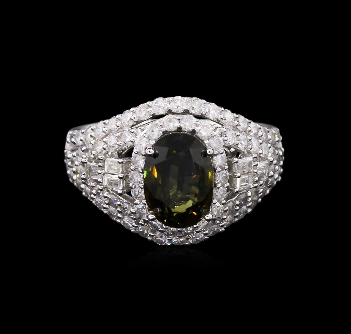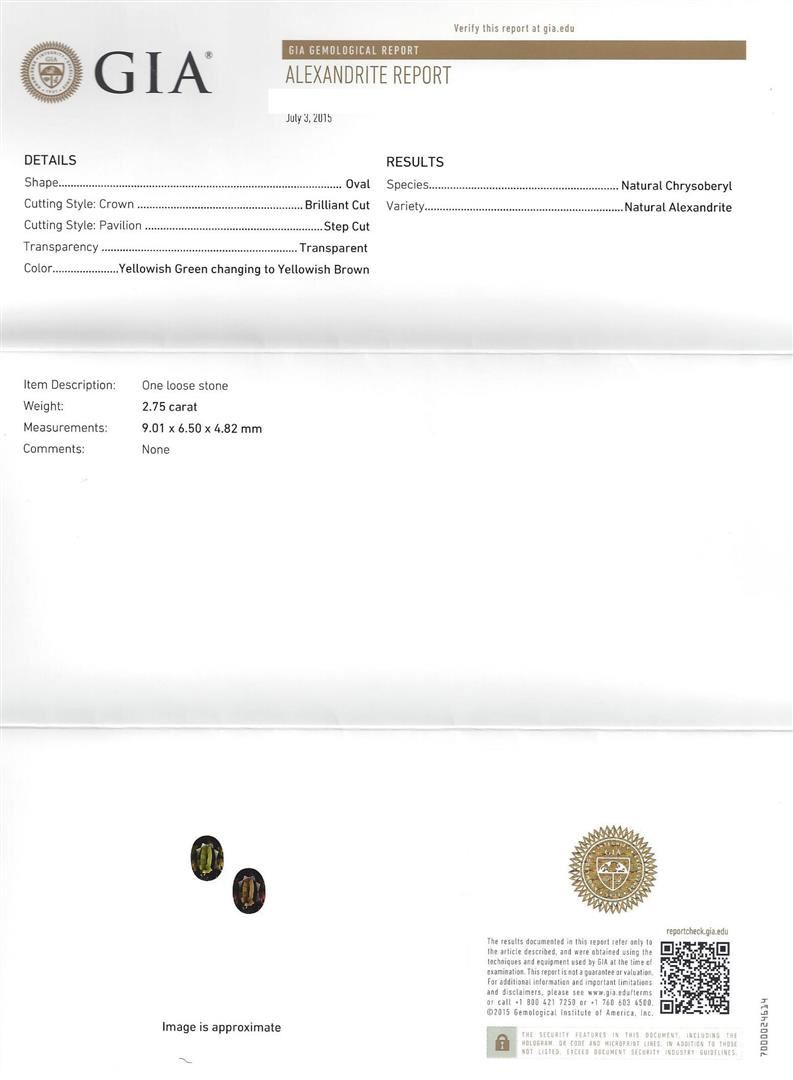One electronically tested 14KT white gold ladies cast alexandrite and diamond ring with a bright polish finish. The featured alexandrite is set within an inner diamond bezel and an outer diamond set gallery supported by elaborate diamond set shoulders, completed by a two and one-half millimeter wide band. Trademark is Orianne. Identified with markings of "14K". Condition is new, good workmanship. Containing: One prong set oval mixed cut natural alexandrite, measuring 9.01 x 6.50 x 4.82mm, exact weight 2.75ct., type II Clarity is eye clean, medium dark, very slightly grayish, yellowish green color, (GIA yG 6/3) to medium dark, very slightly grayish, yellowish brown, (GIA yBr 6/3), cut is good. Transmitting light with no distortion, transparent. GIA Gemological Report attached. Graded loose prior to setting in the GIA Laboratory, Report #2206321949.The yellowish geen color was photographed under 6000K daylight; the yellowish brown color was photographed under 2000K incandescent light, see the photographs to the right. Alexandrite was discovered in the 1830's near the Tokovaya River in the Ural Mountains of Siberian Russia. It later became the national gemstone of Russia. The name "alexandrite" became official in 1842.Alexandrite is a variety of chrysoberyl. It contains both beryllium and chromium. It is the chromium that accounts for the spectacular color change. The color change is the primary qualification for a chrysoberyl to be considered alexandrite. Alexandrite is strongly trichroic. Its color change results in a near-equal transmission of the blue-green and red portions of the spectrum, coupled with strong absorption in the yellow. Today Alexandrite is found in Brazil, India, Madagascar, Myanmar, Russia, Sri Lanka, Tanzania and Zimbabwe. Eighty-Two prong & channel set round brilliant & baguette cut diamonds approximate total weight of 82 Stones = 1.58ct. Graded in the setting. Clarity: SI-2 to I-2. Color: G - I. Total Weight of Colored Stones 2.75ct. Total Weight of Diamonds 1.58ct. Total Weight of Ring 5.90gm. AIG Appraised at $19,745.00.