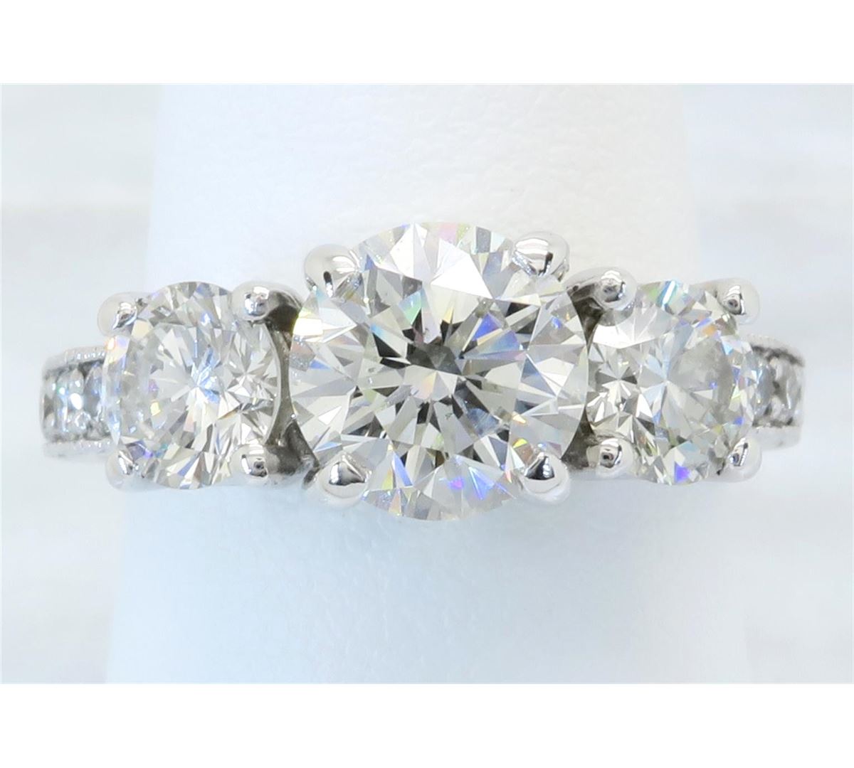 One tested 14K white gold diamond ring. Containing: One GIA Certified Round Brilliant Cut Diamond. Size: 1.50CT, Clarity: SI2, Color: H. 8 Round Brilliant Cut Diamonds. Approximate total diamond weight: 2.76CTW. All diamonds are graded in the mounting unless otherwise stated. Weight of ring: 5.5 grams, Size: 6.5.