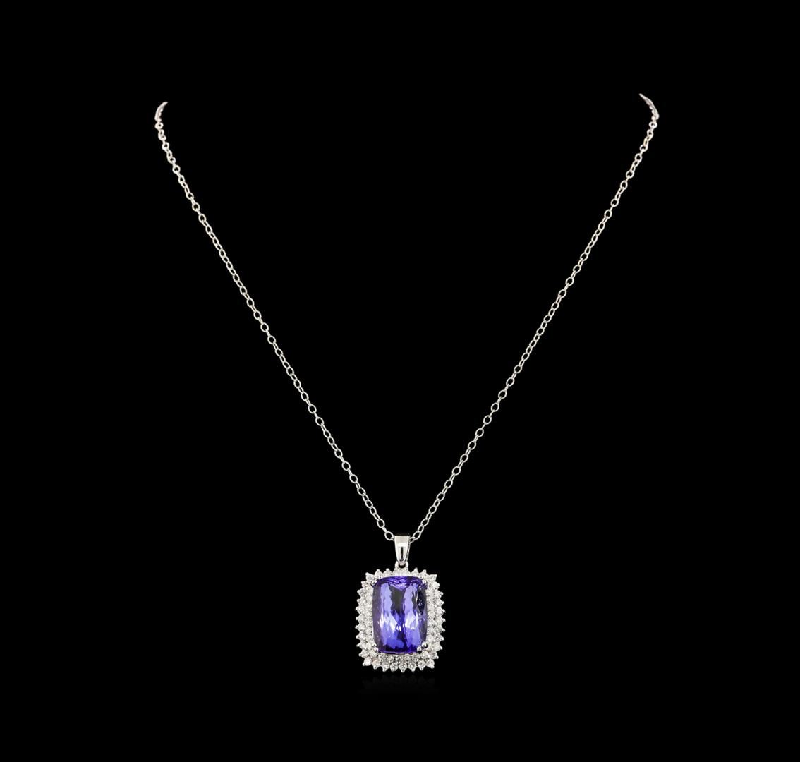 One electronically tested 14KT white gold lady's combination cast & assembled fashion pendant & chain 18.0' long, 2mm twisted oval cable link with a lobster claw clasp with a double basket halo with a bright polish finish. Identified with markings of '14K'. Condition is new, good workmanship. Containing: One prong set rectangular cushion modified brilliant cut natural tanzanite, measuring 18.16 x 12.75 x 9.36mm, (depth est.) 18%. bulge factor, approximate weight of 20.21ct., clarity is eye clean, medium, moderately strong, bluish violet color, (GIA bV 5/4), cut is very good. Transmitting light with no distortion, transparent. Colored gemstones are presumed to have been subjected to commonly used enhancement processes. Graded loose prior to setting in the GIA Laboratory, Report #2175668731. Thirty-Four prong set round brilliant cut diamonds, measuring 2.00 - 1.90 x 1.21mm (depth est.) approximate total weight of 34 Stones = 0.95ct. Graded in the setting. Clarity SI-1 to I-1. Color: H - I Cut Good Thirty prong set round brilliant cut diamonds, measuring 1.85 - 1.75 x 1.12mm (depth est.) approximate total weight of 30 Stones = 0.66ct. Graded in the setting. Clarity SI-1 to SI-2. Color: H - I Cut Good. Total Weight of Colored Stones 20.21ct.. Total Weight of Diamonds 1.61ct.. Total Weight of Pendant & Chain 13.50gm. GAS Appraised at $27,945.00.