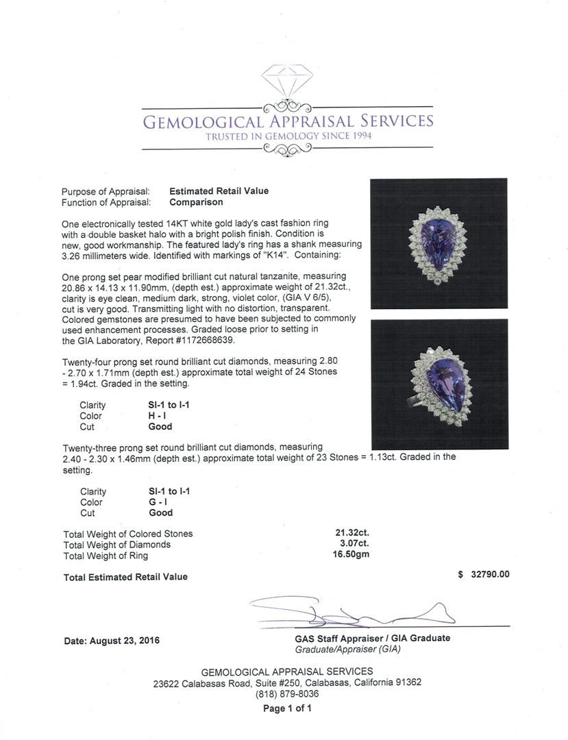 One electronically tested 14KT white gold lady's cast fashion ring with a double basket halo with a bright polish finish. The featured lady's ring has a shank measuring 3.26 millimeters wide. Identified with markings of 'K14'. Condition is new, good workmanship. Containing: One prong set pear modified brilliant cut natural tanzanite, measuring 20.86 x 14.13 x 11.90mm, (depth est.) approximate weight of 21.32ct., clarity is eye clean, medium dark, strong, violet color, (GIA V 6/5), cut is very good. Transmitting light with no distortion, transparent. Colored gemstones are presumed to have been subjected to commonly used enhancement processes. Graded loose prior to setting in the GIA Laboratory, Report #1172668639. Twenty-Four prong set round brilliant cut diamonds, measuring 2.80 - 2.70 x 1.71mm (depth est.) approximate total weight of 24 Stones = 1.94ct. Graded in the setting. Clarity SI-1 to I-1. Color: H - I Cut Good Twenty-Three prong set round brilliant cut diamonds, measuring 2.40 - 2.30 x 1.46mm (depth est.) approximate total weight of 23 Stones = 1.13ct. Graded in the setting. Clarity SI-1 to I-1. Color: G - I Cut Good. Total Weight of Colored Stones 21.32ct.. Total Weight of Diamonds 3.07ct.. Total Weight of Ring 16.50gm. GAS Appraised at $32,790.00.