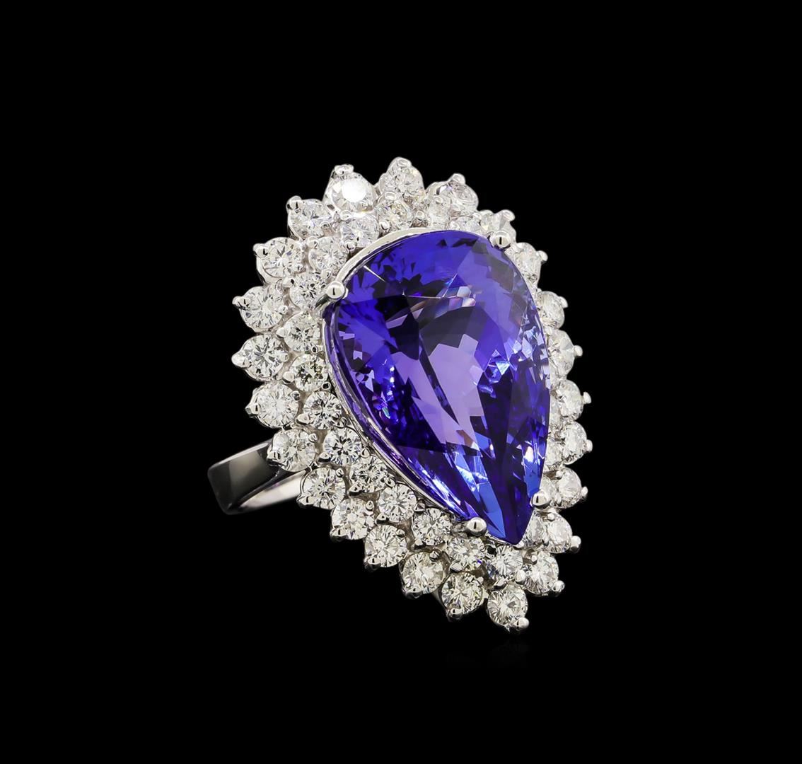 One electronically tested 14KT white gold lady's cast fashion ring with a double basket halo with a bright polish finish. The featured lady's ring has a shank measuring 3.26 millimeters wide. Identified with markings of 'K14'. Condition is new, good workmanship. Containing: One prong set pear modified brilliant cut natural tanzanite, measuring 20.86 x 14.13 x 11.90mm, (depth est.) approximate weight of 21.32ct., clarity is eye clean, medium dark, strong, violet color, (GIA V 6/5), cut is very good. Transmitting light with no distortion, transparent. Colored gemstones are presumed to have been subjected to commonly used enhancement processes. Graded loose prior to setting in the GIA Laboratory, Report #1172668639. Twenty-Four prong set round brilliant cut diamonds, measuring 2.80 - 2.70 x 1.71mm (depth est.) approximate total weight of 24 Stones = 1.94ct. Graded in the setting. Clarity SI-1 to I-1. Color: H - I Cut Good Twenty-Three prong set round brilliant cut diamonds, measuring 2.40 - 2.30 x 1.46mm (depth est.) approximate total weight of 23 Stones = 1.13ct. Graded in the setting. Clarity SI-1 to I-1. Color: G - I Cut Good. Total Weight of Colored Stones 21.32ct.. Total Weight of Diamonds 3.07ct.. Total Weight of Ring 16.50gm. GAS Appraised at $32,790.00.