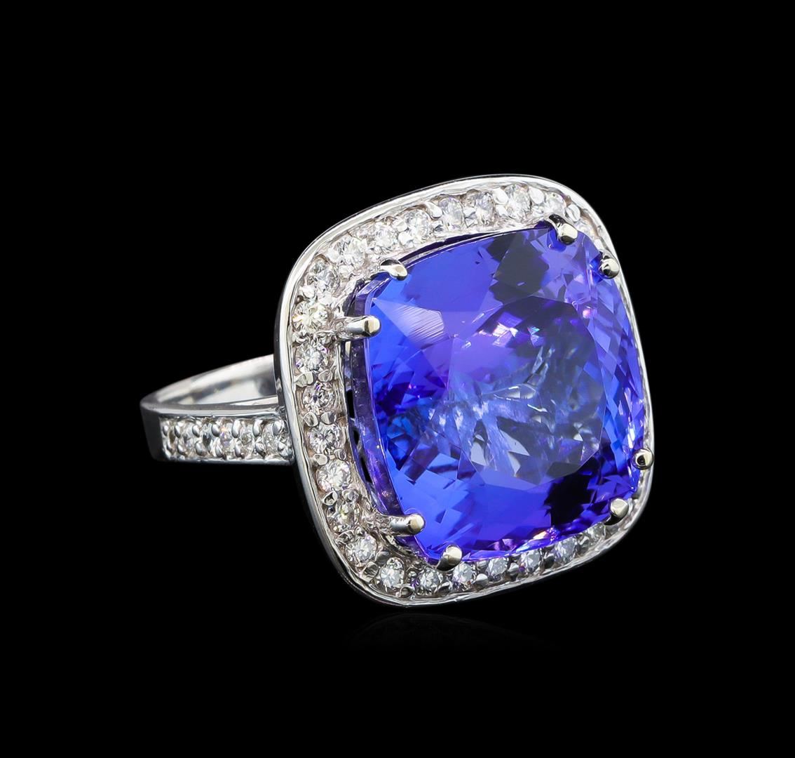 One electronically tested 14KT white gold lady's cast fashion ring with a cathedral shank with a basket halo with a bright polish finish. The featured lady's ring has a shank measuring 2.78 millimeters wide. Identified with markings of 'K14'. Condition is new, good workmanship. Containing: One prong set square cushion modified brilliant cut natural tanzanite, measuring 15.93 x 15.69 x 10.20mm, (depth est.) 5%. bulge factor, approximate weight of 21.38ct., clarity is eye clean, medium, moderately strong, violetish blue color, (GIA vB 5/4), cut is very good. Transmitting light with no distortion, transparent. Colored gemstones are presumed to have been subjected to commonly used enhancement processes. Graded loose prior to setting in the GIA Laboratory, Report #2175668773. Forty-Two prong set round brilliant cut diamonds, measuring 1.80 - 1.70 x 1.05mm (depth est.) approximate total weight of 42 Stones = 0.83ct. Graded in the setting. Clarity SI-1 to I-1. Color: G - H Cut Good. Total Weight of Colored Stones 21.38ct.. Total Weight of Diamonds 0.83ct.. Total Weight of Ring 14.30gm. GAS Appraised at $34,460.00.
