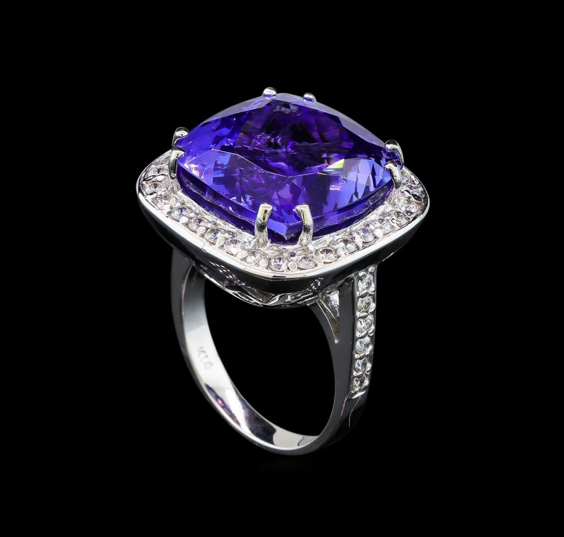 One electronically tested 14KT white gold lady's cast fashion ring with a cathedral shank with a basket halo with a bright polish finish. The featured lady's ring has a shank measuring 2.78 millimeters wide. Identified with markings of 'K14'. Condition is new, good workmanship. Containing: One prong set square cushion modified brilliant cut natural tanzanite, measuring 15.93 x 15.69 x 10.20mm, (depth est.) 5%. bulge factor, approximate weight of 21.38ct., clarity is eye clean, medium, moderately strong, violetish blue color, (GIA vB 5/4), cut is very good. Transmitting light with no distortion, transparent. Colored gemstones are presumed to have been subjected to commonly used enhancement processes. Graded loose prior to setting in the GIA Laboratory, Report #2175668773. Forty-Two prong set round brilliant cut diamonds, measuring 1.80 - 1.70 x 1.05mm (depth est.) approximate total weight of 42 Stones = 0.83ct. Graded in the setting. Clarity SI-1 to I-1. Color: G - H Cut Good. Total Weight of Colored Stones 21.38ct.. Total Weight of Diamonds 0.83ct.. Total Weight of Ring 14.30gm. GAS Appraised at $34,460.00.