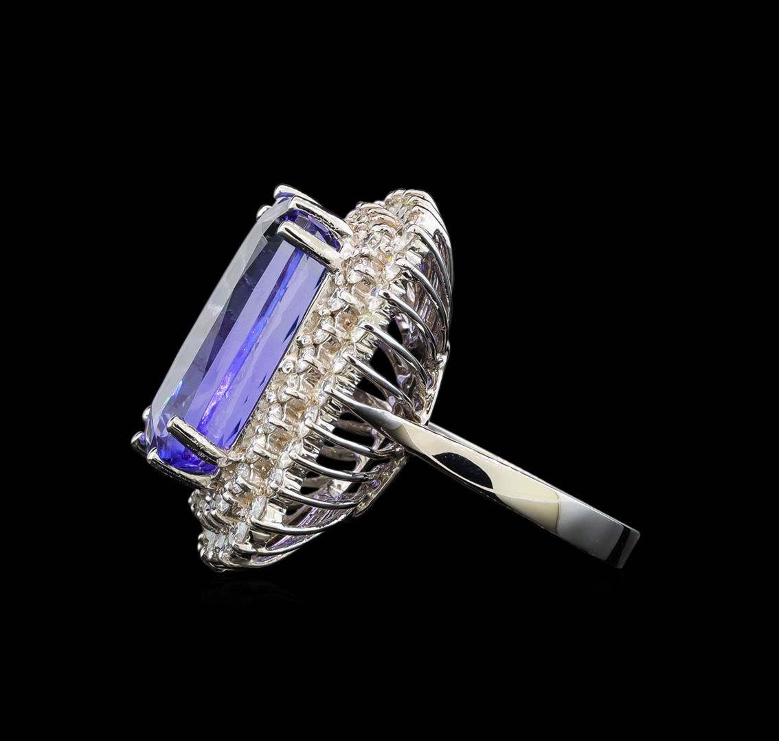 One electronically tested 14KT white gold lady's cast fashion ring with a double basket halo with a bright polish finish. The featured lady's ring has a shank measuring 2.94 millimeters wide. Identified with markings of 'K14'. Condition is new, good workmanship. Containing: One prong set rectangular cushion modified brilliant cut natural tanzanite, measuring 19.52 x 13.46 x 8.34mm, (depth est.) 25%. bulge factor, approximate weight of 21.48ct., clarity is eye clean, medium light, moderately strong, violet color, (GIA V 4/4), cut is very good. Transmitting light with no distortion, transparent. Colored gemstones are presumed to have been subjected to commonly used enhancement processes. Graded loose prior to setting in the GIA Laboratory, Report #2175668706. Thirty-Two prong set round brilliant cut diamonds, measuring 2.40 - 2.30 x 1.46mm (depth est.) approximate total weight of 32 Stones = 1.56ct. Graded in the setting. Clarity SI-1 to I-1. Color: H - I Cut Good Twenty-Eight prong set round brilliant cut diamonds, measuring 2.10 - 2.00 x 1.23mm (depth est.) approximate total weight of 28 Stones = 0.88ct. Graded in the setting. Clarity SI-1 to SI-2. Color: G - H Cut Good. Total Weight of Colored Stones 21.48ct.. Total Weight of Diamonds 2.44ct.. Total Weight of Ring 14.70gm. GAS Appraised at $29,840.00.