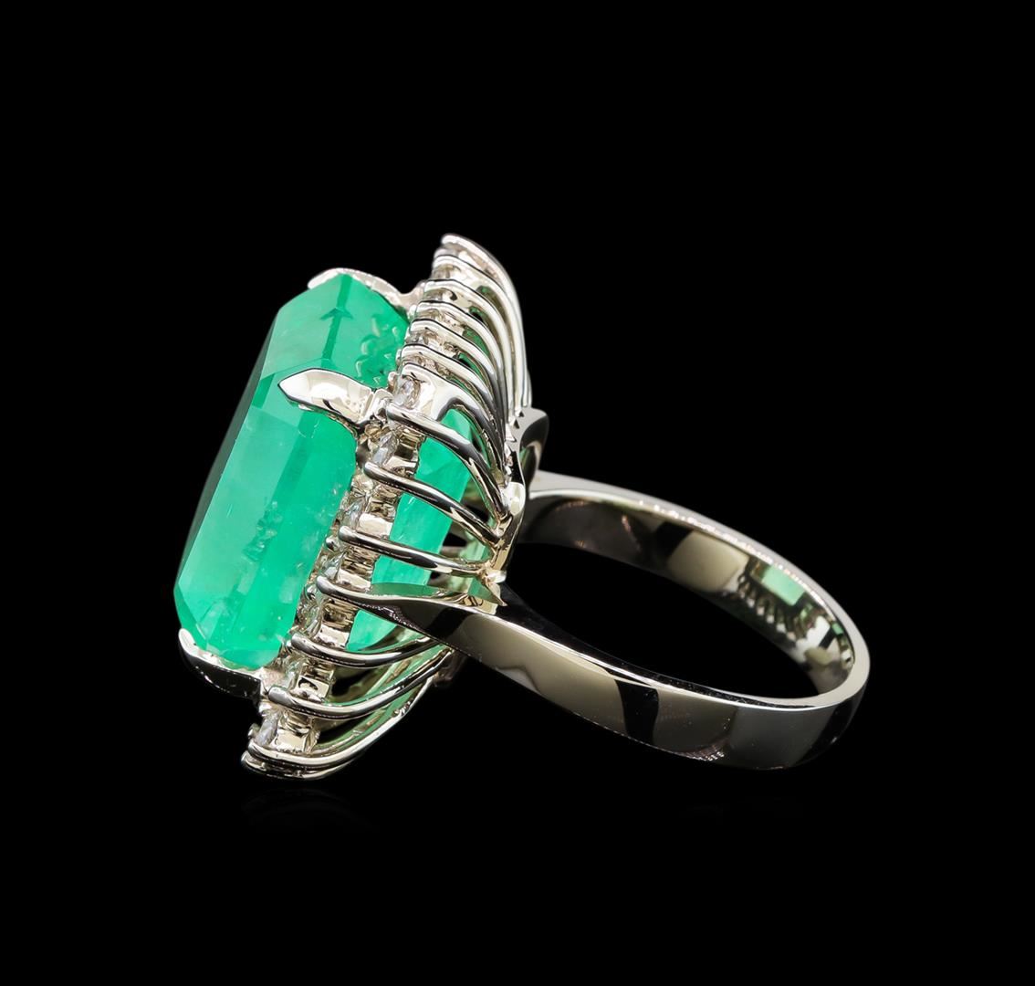 One electronically tested 14KT white gold lady's cast fashion ring with a basket halo with a bright polish finish. The featured lady's ring has a shank measuring 3.20 millimeters wide. Identified with markings of 'K14'. Condition is new, good workmanship. Containing: One prong set emerald standard step cut natural emerald, measuring 16.35 x 16.02 x 10.59mm, (depth est.) 7%. bulge factor, approximate weight of 21.72ct., clarity is heavily included, medium light, moderately strong, green color, (GIA G 4/4), cut is very good. Transmitting light somewhat diffusely, semi-transparent to translucent. Naturally occurring internal & external characteristics are present. Indications of oil residue. Clarity enhanced. Colored gemstones are presumed to have been subjected to commonly used enhancement processes. Graded loose prior to setting in the GIA Laboratory, Report #5171668600. Twenty-Four prong set round brilliant cut diamonds, measuring 2.60 - 2.55 x 1.60mm (depth est.) approximate total weight of 24 Stones = 1.57ct. Graded in the setting. Clarity SI-1 to I-1. Color: H - I Cut Good. Total Weight of Colored Stones 21.72ct.. Total Weight of Diamonds 1.57ct.. Total Weight of Ring 12.30gm. GAS Appraised at $22,405.00.