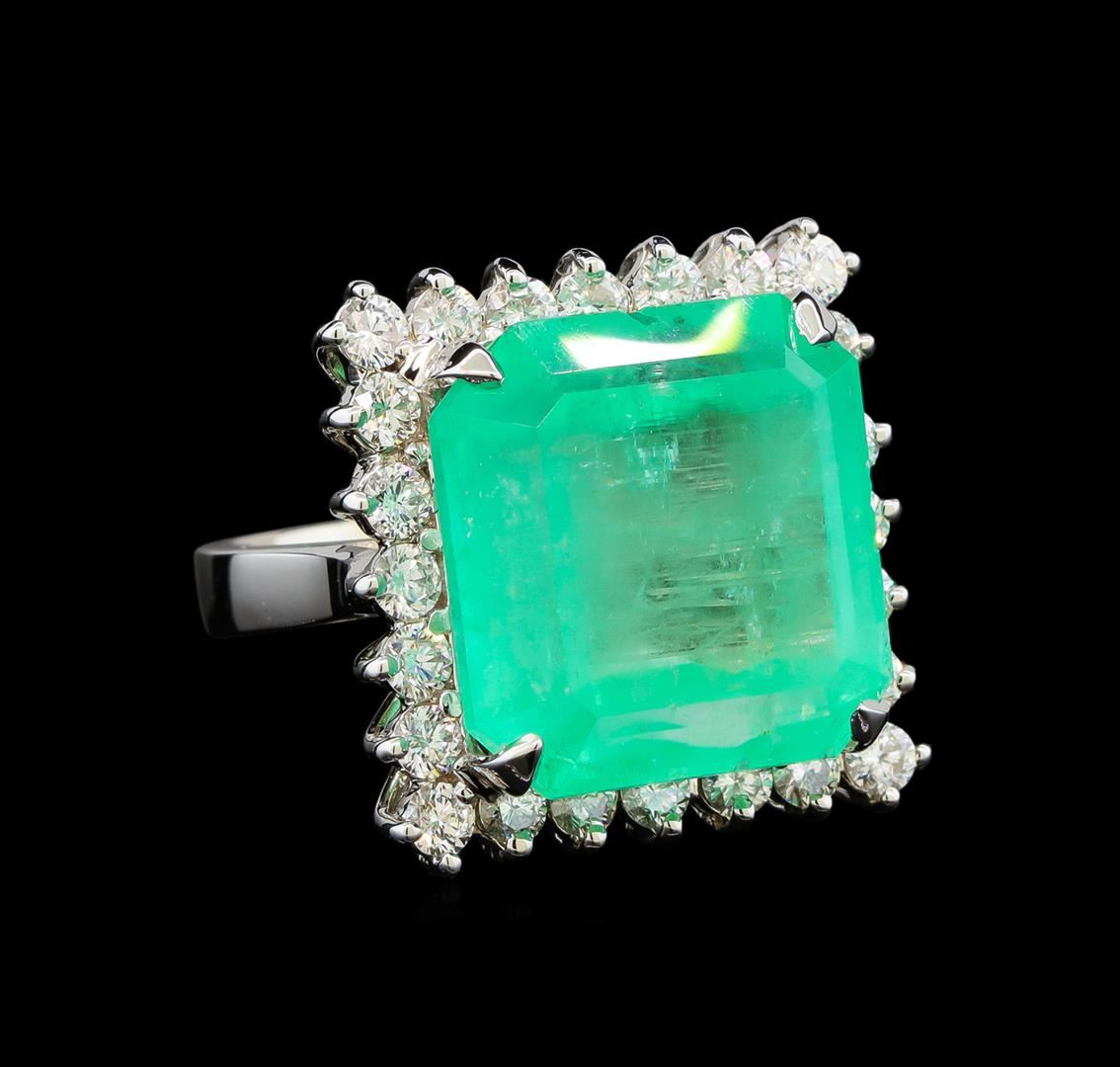 One electronically tested 14KT white gold lady's cast fashion ring with a basket halo with a bright polish finish. The featured lady's ring has a shank measuring 3.20 millimeters wide. Identified with markings of 'K14'. Condition is new, good workmanship. Containing: One prong set emerald standard step cut natural emerald, measuring 16.35 x 16.02 x 10.59mm, (depth est.) 7%. bulge factor, approximate weight of 21.72ct., clarity is heavily included, medium light, moderately strong, green color, (GIA G 4/4), cut is very good. Transmitting light somewhat diffusely, semi-transparent to translucent. Naturally occurring internal & external characteristics are present. Indications of oil residue. Clarity enhanced. Colored gemstones are presumed to have been subjected to commonly used enhancement processes. Graded loose prior to setting in the GIA Laboratory, Report #5171668600. Twenty-Four prong set round brilliant cut diamonds, measuring 2.60 - 2.55 x 1.60mm (depth est.) approximate total weight of 24 Stones = 1.57ct. Graded in the setting. Clarity SI-1 to I-1. Color: H - I Cut Good. Total Weight of Colored Stones 21.72ct.. Total Weight of Diamonds 1.57ct.. Total Weight of Ring 12.30gm. GAS Appraised at $22,405.00.