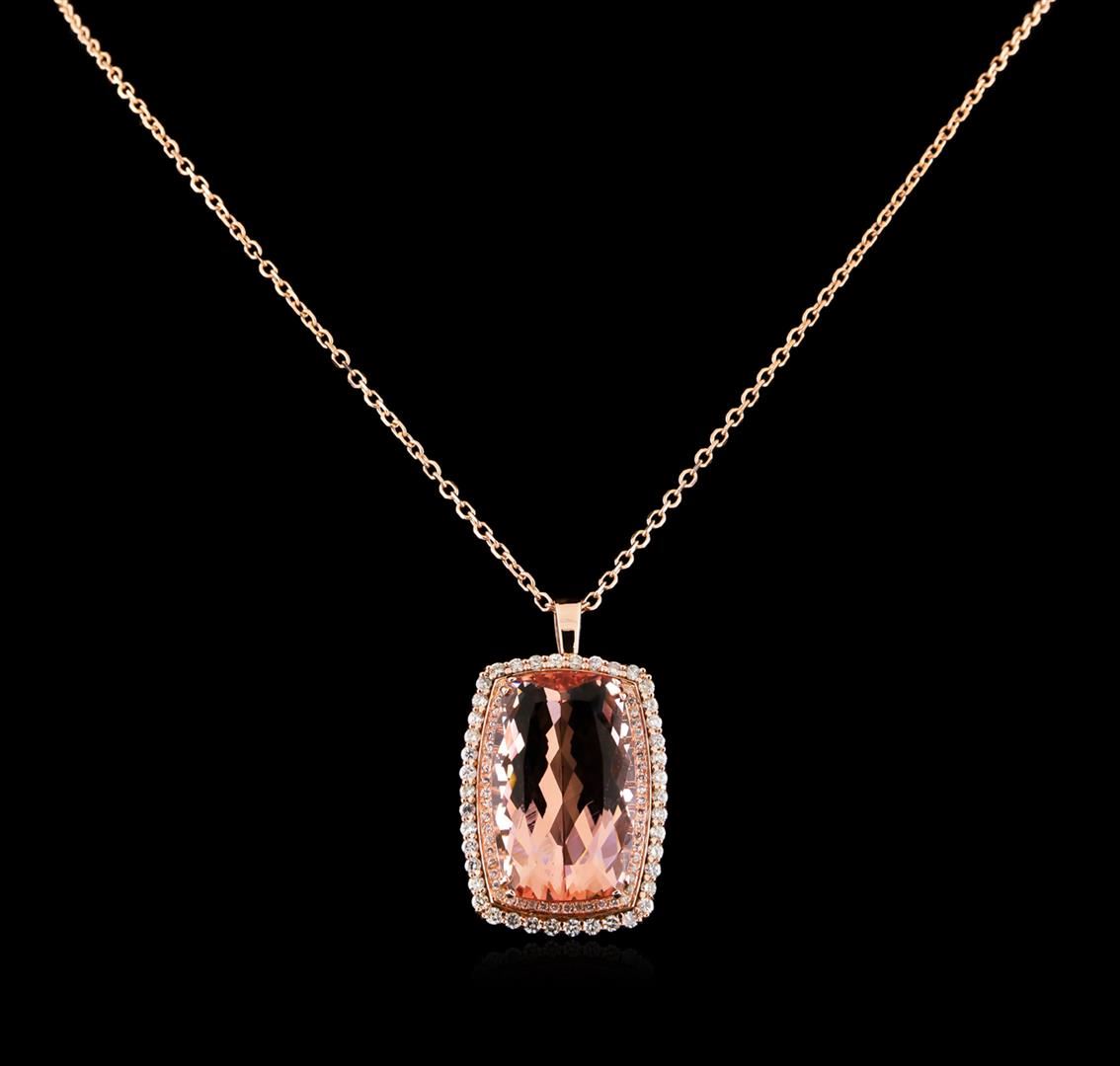 One prong set cushion modified brilliant cut natural morganite, measuring 31.57 x 19.50 x 11.95mm, exact weight 51.91ct., clarity is eye clean, type I, cut is good. Transmitting light with no distortion, transparent. GIA Colored Stone Grading Report attached. Graded loose prior to setting in the GIA Laboratory, Report # 6157957719.Forty-Two prong set round brilliant cut diamonds, measuring 2.30 - 2.30 x 1.38mm (depth est.) approximate total weight of 42 Stones = 1.87ct. Color & clarity grade are an average for the group. Graded in the setting. Clarity: SI-2 to I-2. Color: H - J Sixty prong set round brilliant cut diamonds, measuring 1.50 - 1.40 x 0.87mm (depth est.) approximate total weight of 60 Stones = 0.67ct. Color & clarity grade are an average for the group. Graded in the setting. Clarity: SI-2 to I-2. Color: G - I. Total Weight of Colored Stones 51.91ct. Total Weight of Diamonds 2.54ct. Total Weight of Pendant With Chain 28.65gm. AIG Appraised at $37,795.00.