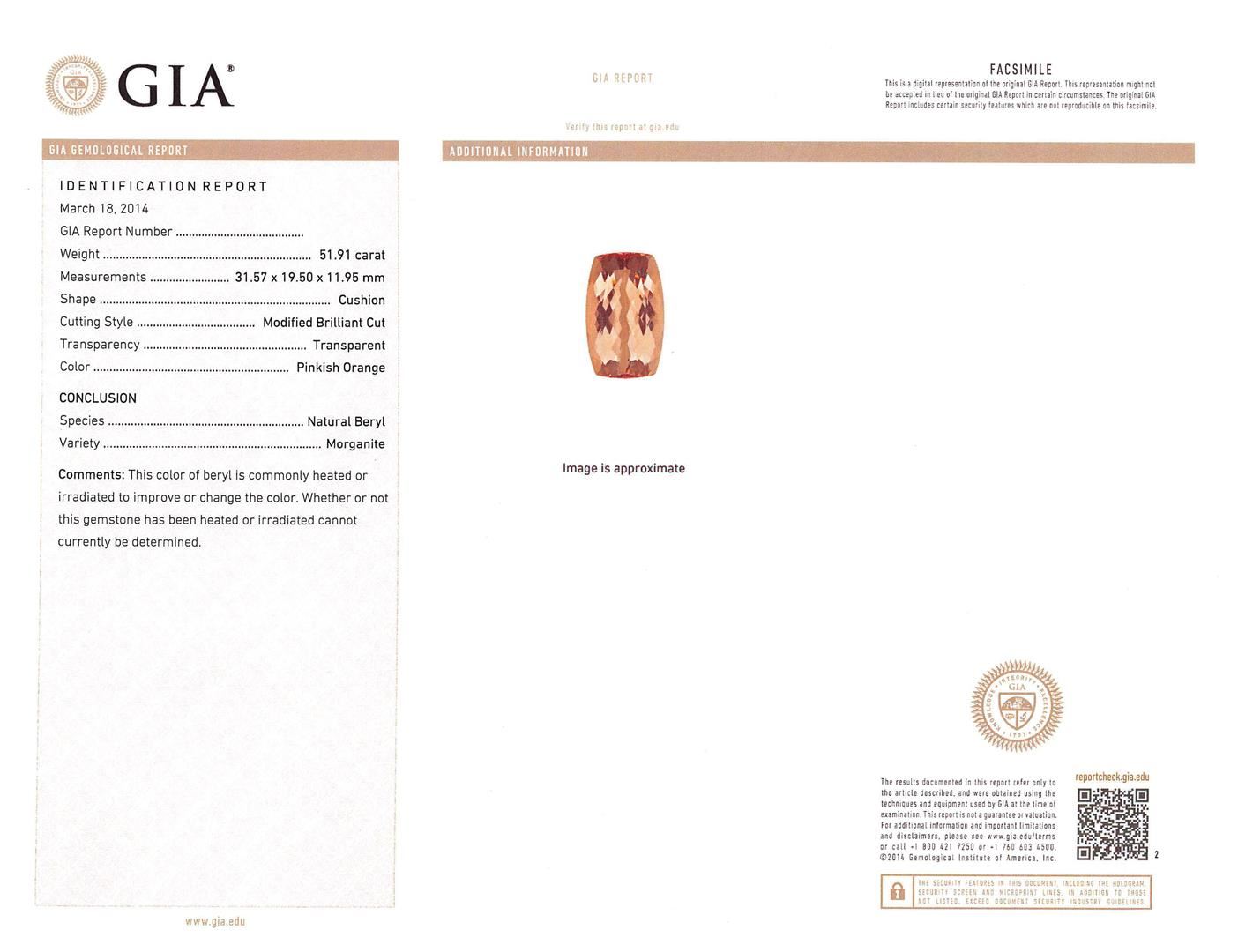 One prong set cushion modified brilliant cut natural morganite, measuring 31.57 x 19.50 x 11.95mm, exact weight 51.91ct., clarity is eye clean, type I, cut is good. Transmitting light with no distortion, transparent. GIA Colored Stone Grading Report attached. Graded loose prior to setting in the GIA Laboratory, Report # 6157957719.Forty-Two prong set round brilliant cut diamonds, measuring 2.30 - 2.30 x 1.38mm (depth est.) approximate total weight of 42 Stones = 1.87ct. Color & clarity grade are an average for the group. Graded in the setting. Clarity: SI-2 to I-2. Color: H - J Sixty prong set round brilliant cut diamonds, measuring 1.50 - 1.40 x 0.87mm (depth est.) approximate total weight of 60 Stones = 0.67ct. Color & clarity grade are an average for the group. Graded in the setting. Clarity: SI-2 to I-2. Color: G - I. Total Weight of Colored Stones 51.91ct. Total Weight of Diamonds 2.54ct. Total Weight of Pendant With Chain 28.65gm. AIG Appraised at $37,795.00.