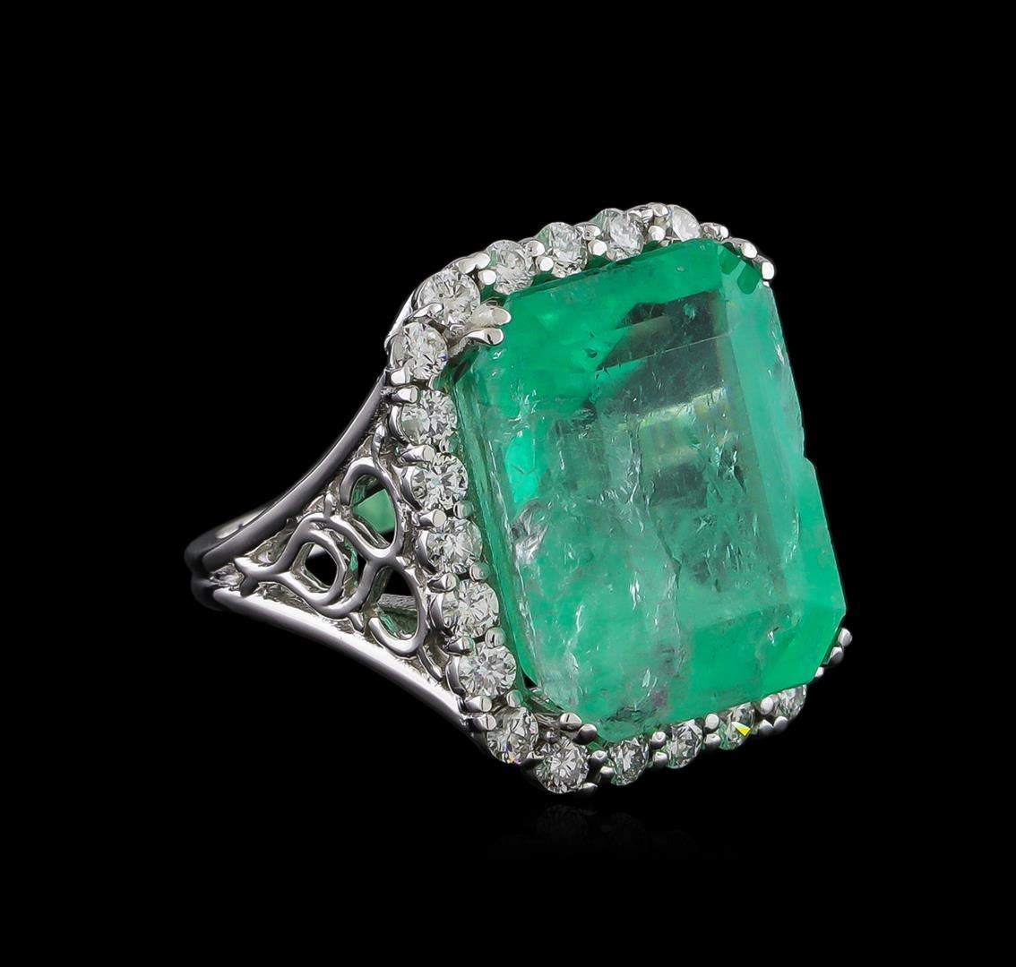 One electronically tested 14KT white gold lady's cast fashion ring with a basket halo with a bright polish finish. The featured lady's ring has a shank measuring 2.60 millimeters wide. Identified with markings of "14K". Condition is new, good workmanship. Containing: One prong set emerald step cut natural emerald, measuring 18.69 x 14.89 x 10.73mm, 3%. bulge factor, exact weight 22.51ct., clarity is heavily included, type III, medium light, very slightly grayish, green color, (GIA G 4/3), cut is good. Transmitting light somewhat diffusely, semi-transparent to translucent. Naturally occurring internal & external characteristics are present. Clarity enhanced. Graded loose prior to setting in the GIA Laboratory, Report #1172501603.Twenty-Four prong set round brilliant cut diamonds, measuring 2.40 - 2.30 x 1.46mm (depth est.) approximate total weight of 24 Stones = 1.20ct. Graded in the setting. Clarity: SI-1 to SI-2. Color: H - I. Cut Good. Total Weight of Colored Stones 22.51ct. Total Weight of Diamonds 1.20ct. Total Weight of Ring 13.20gm. GAS Appraised at $13,825.00.