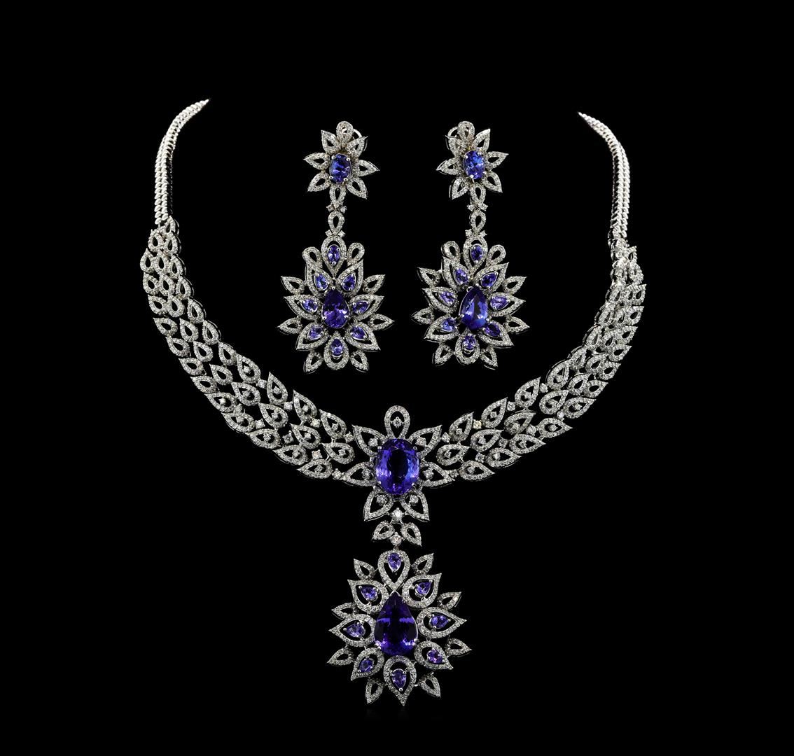 One electronically tested 18KT white gold lady's combination cast & assembled tanzanite and diamond suite. The featured tanzanite and diamond suite contains a seventeen inch long necklace with a tongue clasp with foldover safety and a pair of dangle floral motif earrings with omega clip backs with posts. The necklace is composed of three rows of interlocking diamond encrusted teardrop designs with an attached teardrop starburst motif. Identified with markings of '750'. Containing: One prong set oval modified brilliant cut natural tanzanite, measuring 13.60 x 10.52 x 6.39mm, (depth est.) 14%. bulge factor, approximate weight of 7.33ct., clarity is eye clean, medium, moderately strong, bluish violet color, (GIA bV 5/4), cut is very good. Transmitting light with no distortion, transparent. Colored gemstones are presumed to have been subjected to commonly used enhancement processes. Graded loose prior to setting in the GIA Laboratory, Report #2173665653. One prong set pear modified brilliant cut natural tanzanite, measuring 14.95 x 10.50 x 5.38mm, (depth est.) approximate weight of 5.40ct., clarity is eye clean, medium, moderately strong, bluish violet color, (GIA bV 5/4), cut is very good. Transmitting light with no distortion, transparent. Colored gemstones are presumed to have been subjected to commonly used enhancement processes. Graded in the setting. Two prong set pear modified brilliant cut natural tanzanites, measuring 10.45 x 6.45 x 4.50mm, (depth est.) approximate total weight of 4.00ct., clarity is eye clean, medium, moderately strong, bluish violet color, (GIA bV 5/4), cut is very good. Transmitting light with no distortion, transparent. Colored gemstones are presumed to have been subjected to commonly used enhancement processes. Graded in the setting. Two prong set oval modified brilliant cut natural tanzanites, measuring 6.95 x 5.05 x 3.48mm, (depth est.) 5%. bulge factor, approximate total weight of 1.81ct., clarity is eye clean, medium, moderately strong, bluish violet color, (GIA bV 5/4), cut is very good. Transmitting light with no distortion, transparent. Colored gemstones are presumed to have been subjected to commonly used enhancement processes. Graded in the setting. Twenty-four prong set pear modified brilliant cut natural tanzanites, measuring 4.50 x 3.00 x 1.95mm, (depth est.) approximate total weight of 4.00ct., clarity is eye clean, medium dark, moderately strong, violetish blue color, (GIA vB 6/4), cut is good. Transmitting light with no distortion, transparent. Colored gemstones are presumed to have been subjected to commonly used enhancement processes. Graded in the setting. Twenty-Nine prong set round brilliant cut diamonds, measuring 2.40 - 2.30 x 1.46mm (depth est.) approximate total weight of 29 Stones = 1.43ct. Graded in the setting. Clarity SI-1 to SI-2. Color: H - I Cut Good Thirty-Two prong set round brilliant cut diamonds, measuring 1.50 - 1.40 x 0.90mm (depth est.) approximate total weight of 32 Stones = 0.37ct. Graded in the setting. Clarity SI-1 to I-1. Color: H - I Cut Good One Thousand, Eight Hundred Sixty-Two prong set round brilliant cut diamonds, measuring 1.10 - 1.05 x 0.65mm (depth est.) approximate total weight of 1862 Stones = 8.26ct. Graded in the setting. Clarity SI-1 to I-1. Color: G - I Cut Good. Total Weight of Colored Stones 22.54ct.. Total Weight of Diamonds 10.06ct.. Total Weight of Suite 105.60gm. GAS Appraised at $89,620.00.