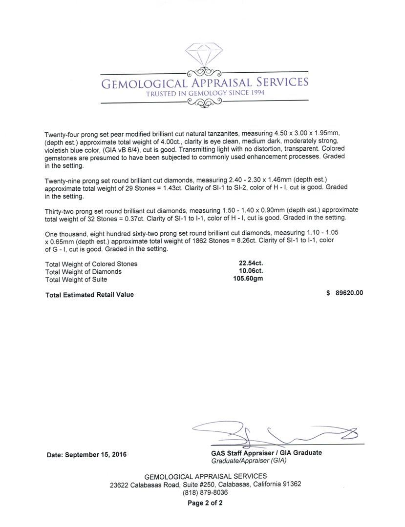 One electronically tested 18KT white gold lady's combination cast & assembled tanzanite and diamond suite. The featured tanzanite and diamond suite contains a seventeen inch long necklace with a tongue clasp with foldover safety and a pair of dangle floral motif earrings with omega clip backs with posts. The necklace is composed of three rows of interlocking diamond encrusted teardrop designs with an attached teardrop starburst motif. Identified with markings of '750'. Containing: One prong set oval modified brilliant cut natural tanzanite, measuring 13.60 x 10.52 x 6.39mm, (depth est.) 14%. bulge factor, approximate weight of 7.33ct., clarity is eye clean, medium, moderately strong, bluish violet color, (GIA bV 5/4), cut is very good. Transmitting light with no distortion, transparent. Colored gemstones are presumed to have been subjected to commonly used enhancement processes. Graded loose prior to setting in the GIA Laboratory, Report #2173665653. One prong set pear modified brilliant cut natural tanzanite, measuring 14.95 x 10.50 x 5.38mm, (depth est.) approximate weight of 5.40ct., clarity is eye clean, medium, moderately strong, bluish violet color, (GIA bV 5/4), cut is very good. Transmitting light with no distortion, transparent. Colored gemstones are presumed to have been subjected to commonly used enhancement processes. Graded in the setting. Two prong set pear modified brilliant cut natural tanzanites, measuring 10.45 x 6.45 x 4.50mm, (depth est.) approximate total weight of 4.00ct., clarity is eye clean, medium, moderately strong, bluish violet color, (GIA bV 5/4), cut is very good. Transmitting light with no distortion, transparent. Colored gemstones are presumed to have been subjected to commonly used enhancement processes. Graded in the setting. Two prong set oval modified brilliant cut natural tanzanites, measuring 6.95 x 5.05 x 3.48mm, (depth est.) 5%. bulge factor, approximate total weight of 1.81ct., clarity is eye clean, medium, moderately strong, bluish violet color, (GIA bV 5/4), cut is very good. Transmitting light with no distortion, transparent. Colored gemstones are presumed to have been subjected to commonly used enhancement processes. Graded in the setting. Twenty-four prong set pear modified brilliant cut natural tanzanites, measuring 4.50 x 3.00 x 1.95mm, (depth est.) approximate total weight of 4.00ct., clarity is eye clean, medium dark, moderately strong, violetish blue color, (GIA vB 6/4), cut is good. Transmitting light with no distortion, transparent. Colored gemstones are presumed to have been subjected to commonly used enhancement processes. Graded in the setting. Twenty-Nine prong set round brilliant cut diamonds, measuring 2.40 - 2.30 x 1.46mm (depth est.) approximate total weight of 29 Stones = 1.43ct. Graded in the setting. Clarity SI-1 to SI-2. Color: H - I Cut Good Thirty-Two prong set round brilliant cut diamonds, measuring 1.50 - 1.40 x 0.90mm (depth est.) approximate total weight of 32 Stones = 0.37ct. Graded in the setting. Clarity SI-1 to I-1. Color: H - I Cut Good One Thousand, Eight Hundred Sixty-Two prong set round brilliant cut diamonds, measuring 1.10 - 1.05 x 0.65mm (depth est.) approximate total weight of 1862 Stones = 8.26ct. Graded in the setting. Clarity SI-1 to I-1. Color: G - I Cut Good. Total Weight of Colored Stones 22.54ct.. Total Weight of Diamonds 10.06ct.. Total Weight of Suite 105.60gm. GAS Appraised at $89,620.00.