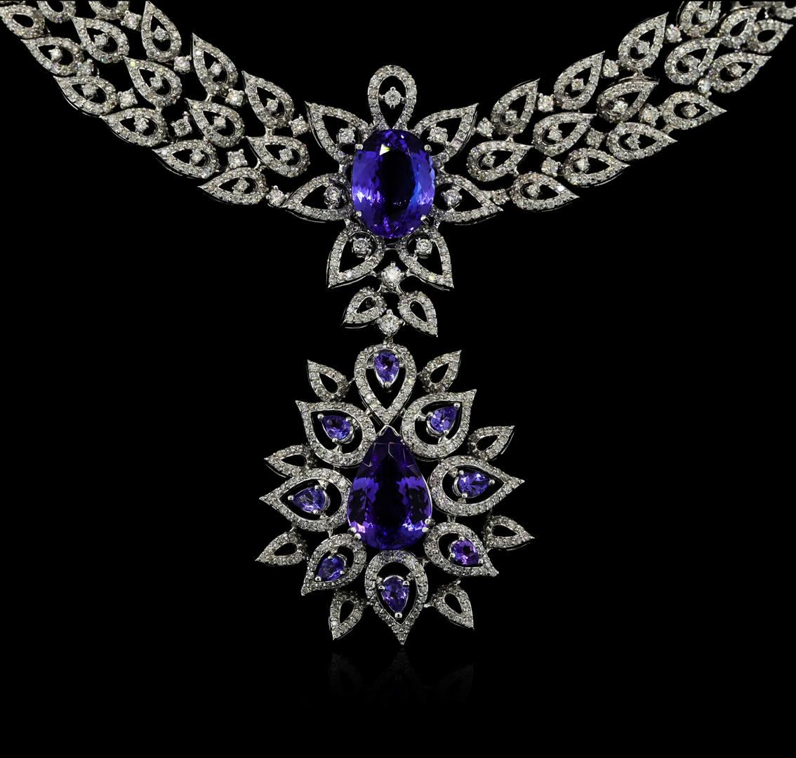 One electronically tested 18KT white gold lady's combination cast & assembled tanzanite and diamond suite. The featured tanzanite and diamond suite contains a seventeen inch long necklace with a tongue clasp with foldover safety and a pair of dangle floral motif earrings with omega clip backs with posts. The necklace is composed of three rows of interlocking diamond encrusted teardrop designs with an attached teardrop starburst motif. Identified with markings of '750'. Containing: One prong set oval modified brilliant cut natural tanzanite, measuring 13.60 x 10.52 x 6.39mm, (depth est.) 14%. bulge factor, approximate weight of 7.33ct., clarity is eye clean, medium, moderately strong, bluish violet color, (GIA bV 5/4), cut is very good. Transmitting light with no distortion, transparent. Colored gemstones are presumed to have been subjected to commonly used enhancement processes. Graded loose prior to setting in the GIA Laboratory, Report #2173665653. One prong set pear modified brilliant cut natural tanzanite, measuring 14.95 x 10.50 x 5.38mm, (depth est.) approximate weight of 5.40ct., clarity is eye clean, medium, moderately strong, bluish violet color, (GIA bV 5/4), cut is very good. Transmitting light with no distortion, transparent. Colored gemstones are presumed to have been subjected to commonly used enhancement processes. Graded in the setting. Two prong set pear modified brilliant cut natural tanzanites, measuring 10.45 x 6.45 x 4.50mm, (depth est.) approximate total weight of 4.00ct., clarity is eye clean, medium, moderately strong, bluish violet color, (GIA bV 5/4), cut is very good. Transmitting light with no distortion, transparent. Colored gemstones are presumed to have been subjected to commonly used enhancement processes. Graded in the setting. Two prong set oval modified brilliant cut natural tanzanites, measuring 6.95 x 5.05 x 3.48mm, (depth est.) 5%. bulge factor, approximate total weight of 1.81ct., clarity is eye clean, medium, moderately strong, bluish violet color, (GIA bV 5/4), cut is very good. Transmitting light with no distortion, transparent. Colored gemstones are presumed to have been subjected to commonly used enhancement processes. Graded in the setting. Twenty-four prong set pear modified brilliant cut natural tanzanites, measuring 4.50 x 3.00 x 1.95mm, (depth est.) approximate total weight of 4.00ct., clarity is eye clean, medium dark, moderately strong, violetish blue color, (GIA vB 6/4), cut is good. Transmitting light with no distortion, transparent. Colored gemstones are presumed to have been subjected to commonly used enhancement processes. Graded in the setting. Twenty-Nine prong set round brilliant cut diamonds, measuring 2.40 - 2.30 x 1.46mm (depth est.) approximate total weight of 29 Stones = 1.43ct. Graded in the setting. Clarity SI-1 to SI-2. Color: H - I Cut Good Thirty-Two prong set round brilliant cut diamonds, measuring 1.50 - 1.40 x 0.90mm (depth est.) approximate total weight of 32 Stones = 0.37ct. Graded in the setting. Clarity SI-1 to I-1. Color: H - I Cut Good One Thousand, Eight Hundred Sixty-Two prong set round brilliant cut diamonds, measuring 1.10 - 1.05 x 0.65mm (depth est.) approximate total weight of 1862 Stones = 8.26ct. Graded in the setting. Clarity SI-1 to I-1. Color: G - I Cut Good. Total Weight of Colored Stones 22.54ct.. Total Weight of Diamonds 10.06ct.. Total Weight of Suite 105.60gm. GAS Appraised at $89,620.00.