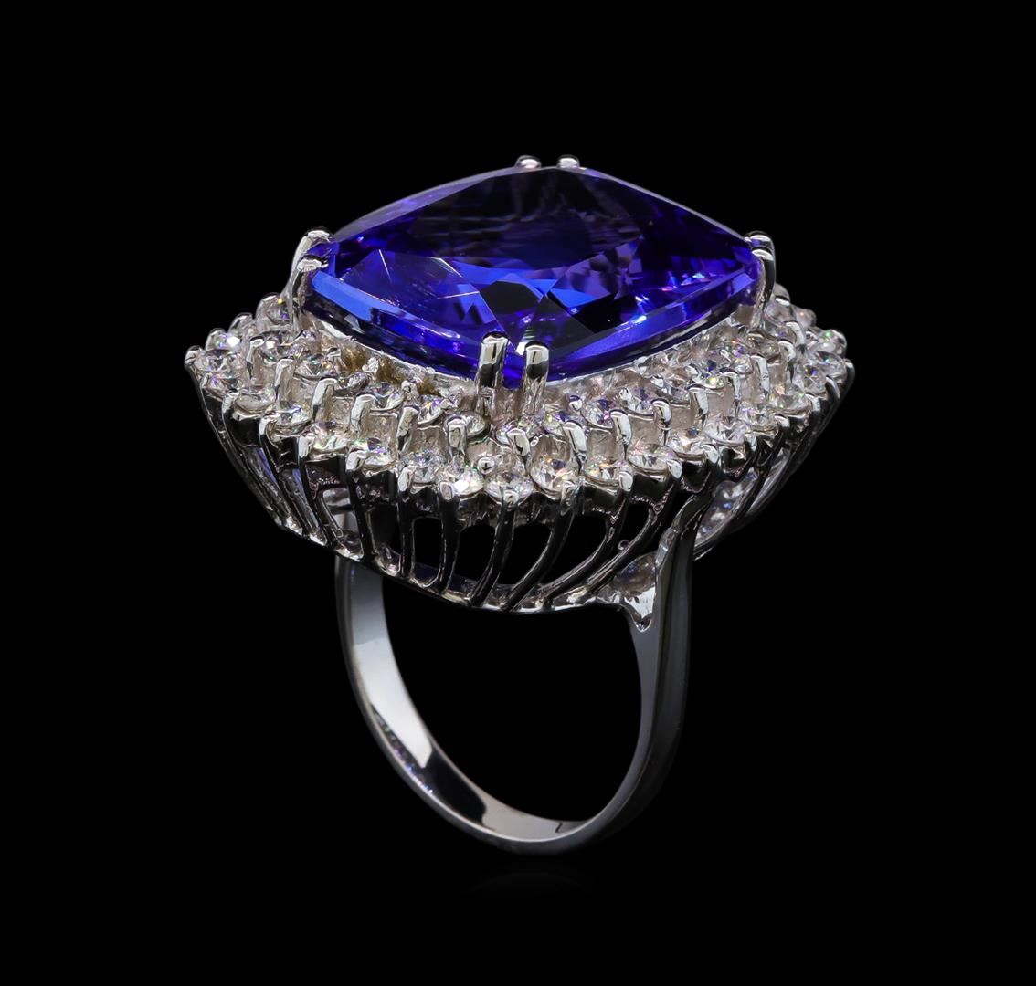 One electronically tested 14KT white gold lady's cast fashion ring with a double basket halo with a bright polish finish. The featured lady's ring has a shank measuring 2.70 millimeters wide. Identified with markings of 'K14'. Condition is new, good workmanship. Containing: One prong set rectangular cushion modified brilliant cut natural tanzanite, measuring 19.10 x 15.65 x 9.05mm, (depth est.) 6%. bulge factor, approximate weight of 22.59ct., clarity is eye clean, medium, moderately strong, bluish violet color, (GIA bV 5/4), cut is very good. Transmitting light with no distortion, transparent. Colored gemstones are presumed to have been subjected to commonly used enhancement processes. Graded loose prior to setting in the GIA Laboratory, Report #2173668607. Thirty-Four prong set round brilliant cut diamonds, measuring 2.40 - 2.30 x 1.41mm (depth est.) approximate total weight of 34 Stones = 1.60ct. Graded in the setting. Clarity SI-1 to I-1. Color: G - H Cut Good Thirty prong set round brilliant cut diamonds, measuring 2.10 - 2.00 x 1.23mm (depth est.) approximate total weight of 30 Stones = 0.91ct. Graded in the setting. Clarity SI-1 to I-1. Color: G - H Cut Good. Total Weight of Colored Stones 22.59ct.. Total Weight of Diamonds 2.51ct.. Total Weight of Ring 15.10gm. GAS Appraised at $38,215.00.