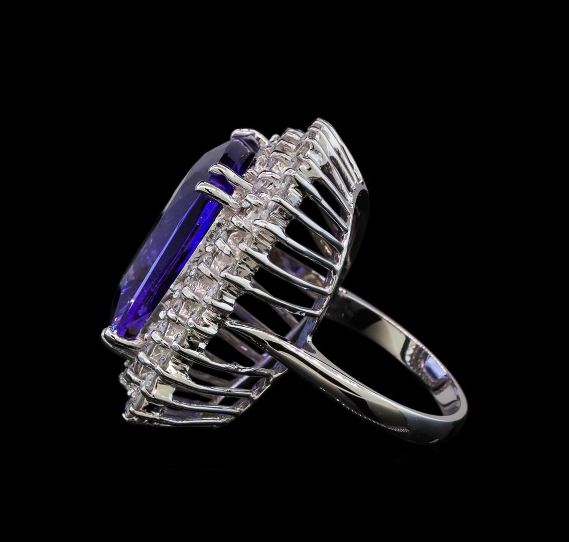 One electronically tested 14KT white gold lady's cast fashion ring with a double basket halo with a bright polish finish. The featured lady's ring has a shank measuring 2.70 millimeters wide. Identified with markings of 'K14'. Condition is new, good workmanship. Containing: One prong set rectangular cushion modified brilliant cut natural tanzanite, measuring 19.10 x 15.65 x 9.05mm, (depth est.) 6%. bulge factor, approximate weight of 22.59ct., clarity is eye clean, medium, moderately strong, bluish violet color, (GIA bV 5/4), cut is very good. Transmitting light with no distortion, transparent. Colored gemstones are presumed to have been subjected to commonly used enhancement processes. Graded loose prior to setting in the GIA Laboratory, Report #2173668607. Thirty-Four prong set round brilliant cut diamonds, measuring 2.40 - 2.30 x 1.41mm (depth est.) approximate total weight of 34 Stones = 1.60ct. Graded in the setting. Clarity SI-1 to I-1. Color: G - H Cut Good Thirty prong set round brilliant cut diamonds, measuring 2.10 - 2.00 x 1.23mm (depth est.) approximate total weight of 30 Stones = 0.91ct. Graded in the setting. Clarity SI-1 to I-1. Color: G - H Cut Good. Total Weight of Colored Stones 22.59ct.. Total Weight of Diamonds 2.51ct.. Total Weight of Ring 15.10gm. GAS Appraised at $38,215.00.