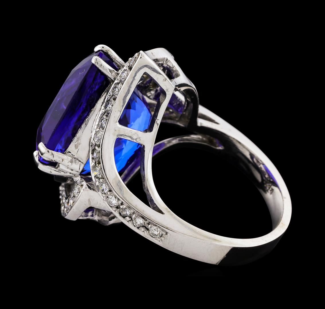 One electronically tested 14KT white gold lady's cast fashion ring with a bypass shank with a halo with a bright polish finish. The featured lady's ring has a shank measuring 3.34 millimeters wide. Identified with markings of 'K14'. Condition is new, good workmanship. Containing: One prong set square cushion modified brilliant cut natural tanzanite, measuring 15.72 x 15.70 x 11.32mm, (depth est.) 5%. bulge factor, approximate weight of 23.29ct., clarity is eye clean, dark, strong, violetish blue color, (GIA vB 7/5), cut is excellent. Transmitting light with no distortion, transparent. Colored gemstones are presumed to have been subjected to commonly used enhancement processes. Graded loose prior to setting in the GIA Laboratory, Report #2171847221. Forty-Two prong set round brilliant cut diamonds, measuring 1.60 - 1.55 x 0.96mm (depth est.) approximate total weight of 42 Stones = 0.61ct. Graded in the setting. Clarity SI-1 to SI-2. Color: G - H Cut Good. Total Weight of Colored Stones 23.29ct.. Total Weight of Diamonds 0.61ct.. Total Weight of Ring 12.70gm. GAS Appraised at $41,155.00.