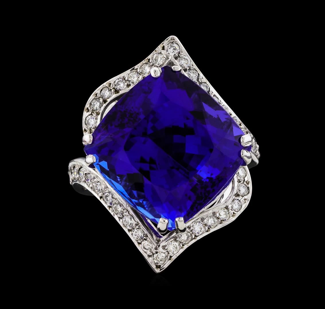 One electronically tested 14KT white gold lady's cast fashion ring with a bypass shank with a halo with a bright polish finish. The featured lady's ring has a shank measuring 3.34 millimeters wide. Identified with markings of 'K14'. Condition is new, good workmanship. Containing: One prong set square cushion modified brilliant cut natural tanzanite, measuring 15.72 x 15.70 x 11.32mm, (depth est.) 5%. bulge factor, approximate weight of 23.29ct., clarity is eye clean, dark, strong, violetish blue color, (GIA vB 7/5), cut is excellent. Transmitting light with no distortion, transparent. Colored gemstones are presumed to have been subjected to commonly used enhancement processes. Graded loose prior to setting in the GIA Laboratory, Report #2171847221. Forty-Two prong set round brilliant cut diamonds, measuring 1.60 - 1.55 x 0.96mm (depth est.) approximate total weight of 42 Stones = 0.61ct. Graded in the setting. Clarity SI-1 to SI-2. Color: G - H Cut Good. Total Weight of Colored Stones 23.29ct.. Total Weight of Diamonds 0.61ct.. Total Weight of Ring 12.70gm. GAS Appraised at $41,155.00.