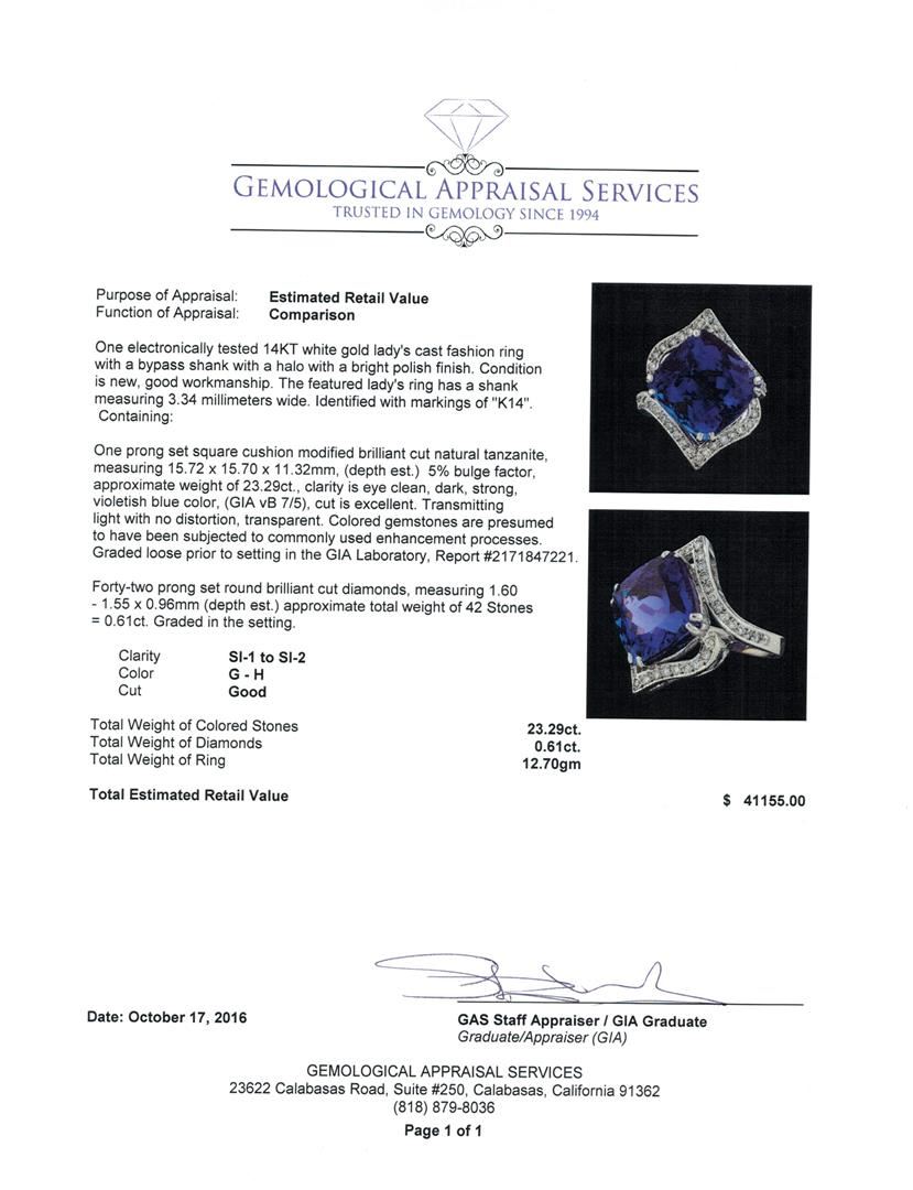 One electronically tested 14KT white gold lady's cast fashion ring with a bypass shank with a halo with a bright polish finish. The featured lady's ring has a shank measuring 3.34 millimeters wide. Identified with markings of 'K14'. Condition is new, good workmanship. Containing: One prong set square cushion modified brilliant cut natural tanzanite, measuring 15.72 x 15.70 x 11.32mm, (depth est.) 5%. bulge factor, approximate weight of 23.29ct., clarity is eye clean, dark, strong, violetish blue color, (GIA vB 7/5), cut is excellent. Transmitting light with no distortion, transparent. Colored gemstones are presumed to have been subjected to commonly used enhancement processes. Graded loose prior to setting in the GIA Laboratory, Report #2171847221. Forty-Two prong set round brilliant cut diamonds, measuring 1.60 - 1.55 x 0.96mm (depth est.) approximate total weight of 42 Stones = 0.61ct. Graded in the setting. Clarity SI-1 to SI-2. Color: G - H Cut Good. Total Weight of Colored Stones 23.29ct.. Total Weight of Diamonds 0.61ct.. Total Weight of Ring 12.70gm. GAS Appraised at $41,155.00.