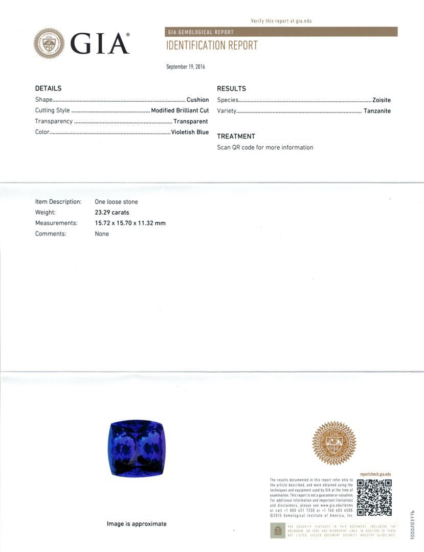One electronically tested 14KT white gold lady's cast fashion ring with a bypass shank with a halo with a bright polish finish. The featured lady's ring has a shank measuring 3.34 millimeters wide. Identified with markings of 'K14'. Condition is new, good workmanship. Containing: One prong set square cushion modified brilliant cut natural tanzanite, measuring 15.72 x 15.70 x 11.32mm, (depth est.) 5%. bulge factor, approximate weight of 23.29ct., clarity is eye clean, dark, strong, violetish blue color, (GIA vB 7/5), cut is excellent. Transmitting light with no distortion, transparent. Colored gemstones are presumed to have been subjected to commonly used enhancement processes. Graded loose prior to setting in the GIA Laboratory, Report #2171847221. Forty-Two prong set round brilliant cut diamonds, measuring 1.60 - 1.55 x 0.96mm (depth est.) approximate total weight of 42 Stones = 0.61ct. Graded in the setting. Clarity SI-1 to SI-2. Color: G - H Cut Good. Total Weight of Colored Stones 23.29ct.. Total Weight of Diamonds 0.61ct.. Total Weight of Ring 12.70gm. GAS Appraised at $41,155.00.