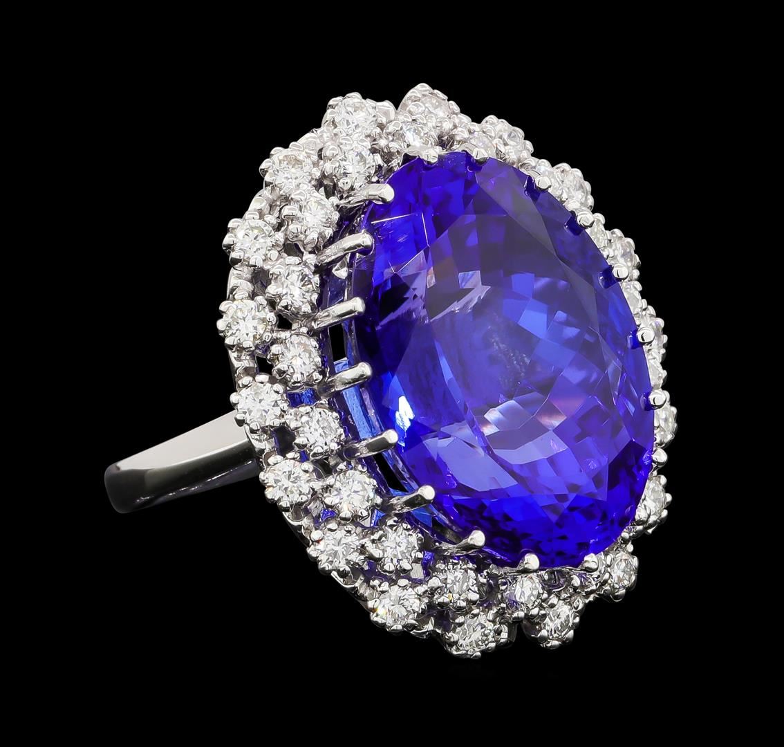 One electronically tested 14KT white gold lady's cast fashion ring with a double basket halo with a bright polish finish. The featured lady's ring has a shank measuring 2.15 millimeters wide. Identified with markings of 'K14'. Condition is new, good workmanship. Containing: One prong set oval modified brilliant cut natural tanzanite, measuring 19.88 x 14.57 x 11.91mm, (depth est.) approximate weight of 24.23ct., clarity is eye clean, dark, moderately strong, violetish blue color, (GIA vB 7/4), cut is very good. Transmitting light with no distortion, transparent. Colored gemstones are presumed to have been subjected to commonly used enhancement processes. Graded loose prior to setting in the GIA Laboratory, Report #6173847687. Thirty-Six prong set round brilliant cut diamonds, measuring 2.10 - 2.00 x 1.25mm (depth est.) approximate total weight of 36 Stones = 1.15ct. Graded in the setting. Clarity SI-1 to SI-2. Color: H - I Cut Good. Total Weight of Colored Stones 24.23ct.. Total Weight of Diamonds 1.15ct.. Total Weight of Ring 15.20gm. GAS Appraised at $33,485.00.