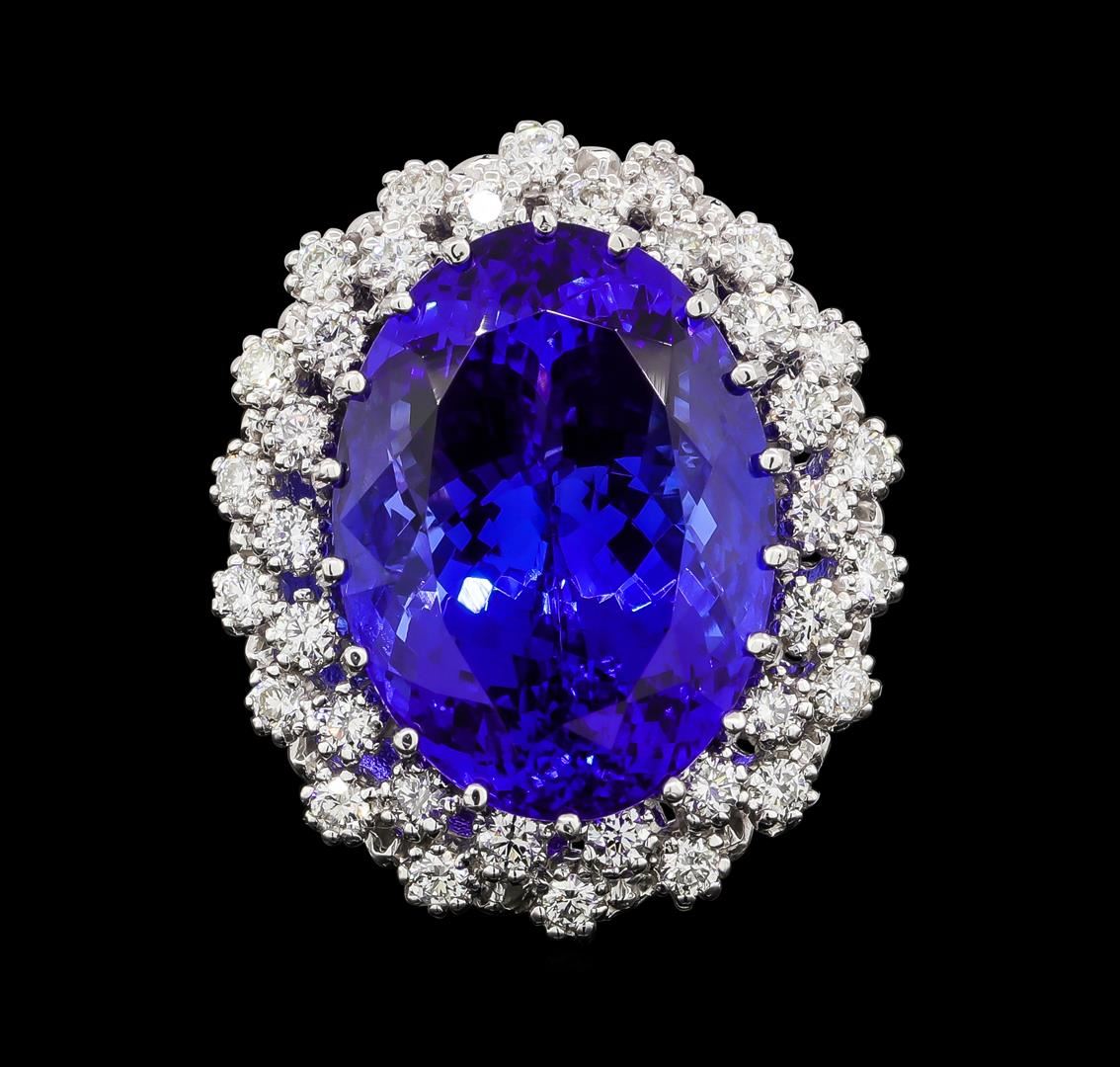 One electronically tested 14KT white gold lady's cast fashion ring with a double basket halo with a bright polish finish. The featured lady's ring has a shank measuring 2.15 millimeters wide. Identified with markings of 'K14'. Condition is new, good workmanship. Containing: One prong set oval modified brilliant cut natural tanzanite, measuring 19.88 x 14.57 x 11.91mm, (depth est.) approximate weight of 24.23ct., clarity is eye clean, dark, moderately strong, violetish blue color, (GIA vB 7/4), cut is very good. Transmitting light with no distortion, transparent. Colored gemstones are presumed to have been subjected to commonly used enhancement processes. Graded loose prior to setting in the GIA Laboratory, Report #6173847687. Thirty-Six prong set round brilliant cut diamonds, measuring 2.10 - 2.00 x 1.25mm (depth est.) approximate total weight of 36 Stones = 1.15ct. Graded in the setting. Clarity SI-1 to SI-2. Color: H - I Cut Good. Total Weight of Colored Stones 24.23ct.. Total Weight of Diamonds 1.15ct.. Total Weight of Ring 15.20gm. GAS Appraised at $33,485.00.