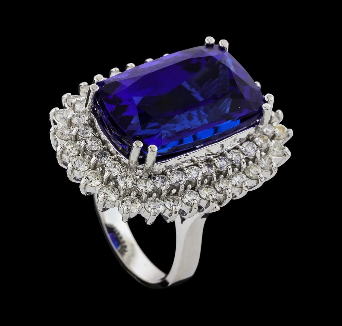 One electronically tested 14KT white gold lady's cast fashion ring with a double basket halo with a bright polish finish. The featured lady's ring has a shank measuring 3.19 millimeters wide. Identified with markings of 'K14'. Condition is new, good workmanship. Containing: One prong set rectangular cushion modified brilliant cut natural tanzanite, measuring 19.89 x 13.02 x 10.11mm, (depth est.) 20%. bulge factor, approximate weight of 24.59ct., clarity is eye clean, dark, strong, violetish blue color, (GIA vB 7/5), cut is very good. Transmitting light with no distortion, transparent. Colored gemstones are presumed to have been subjected to commonly used enhancement processes. Graded loose prior to setting in the GIA Laboratory, Report #6177847039. Thirty prong set round brilliant cut diamonds, measuring 2.40 - 2.30 x 1.41mm (depth est.) approximate total weight of 30 Stones = 1.43ct. Graded in the setting. Clarity SI-1 to SI-2. Color: H - I Cut Good Thirty prong set round brilliant cut diamonds, measuring 2.10 - 2.00 x 1.23mm (depth est.) approximate total weight of 30 Stones = 0.93ct. Graded in the setting. Clarity SI-1 to SI-3. Color: H - I Cut Good. Total Weight of Colored Stones 24.59ct.. Total Weight of Diamonds 2.36ct.. Total Weight of Ring 17.90gm. GAS Appraised at $37,740.00.
