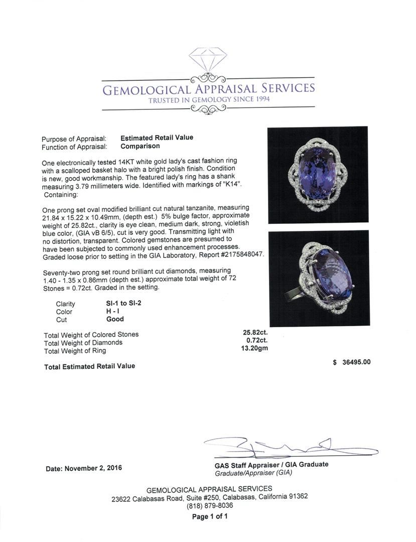 One electronically tested 14KT white gold lady's cast fashion ring with a scalloped basket halo with a bright polish finish. The featured lady's ring has a shank measuring 3.79 millimeters wide. Identified with markings of 'K14'. Condition is new, good workmanship. Containing: One prong set oval modified brilliant cut natural tanzanite, measuring 21.84 x 15.22 x 10.49mm, (depth est.) 5%. bulge factor, approximate weight of 25.82ct., clarity is eye clean, medium dark, strong, violetish blue color, (GIA vB 6/5), cut is very good. Transmitting light with no distortion, transparent. Colored gemstones are presumed to have been subjected to commonly used enhancement processes. Graded loose prior to setting in the GIA Laboratory, Report #2175848047. Seventy-Two prong set round brilliant cut diamonds, measuring 1.40 - 1.35 x 0.86mm (depth est.) approximate total weight of 72 Stones = 0.72ct. Graded in the setting. Clarity SI-1 to SI-2. Color: H - I Cut Good. Total Weight of Colored Stones 25.82ct.. Total Weight of Diamonds 0.72ct.. Total Weight of Ring 13.20gm. GAS Appraised at $36,495.00.
