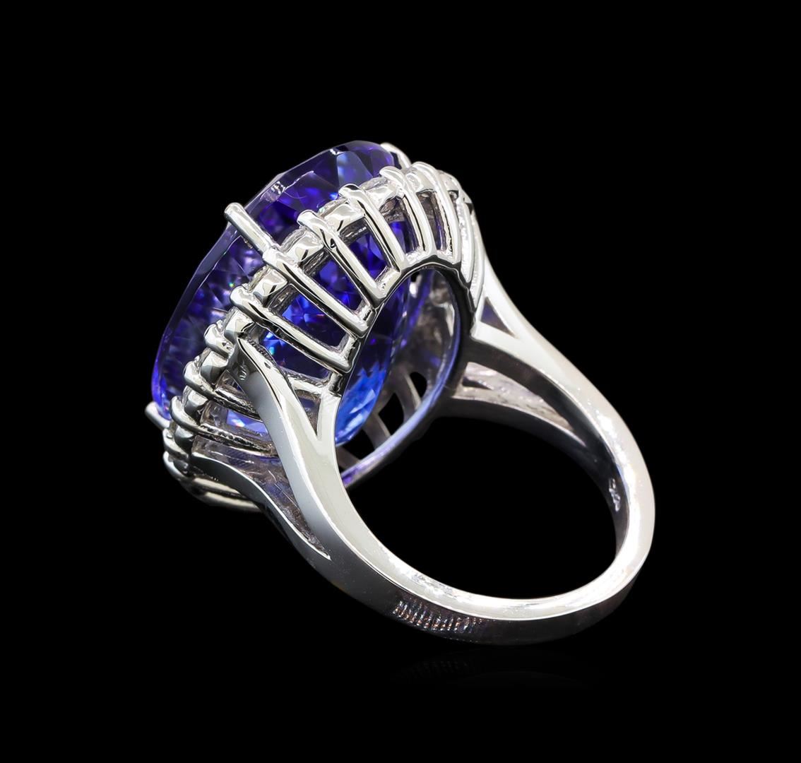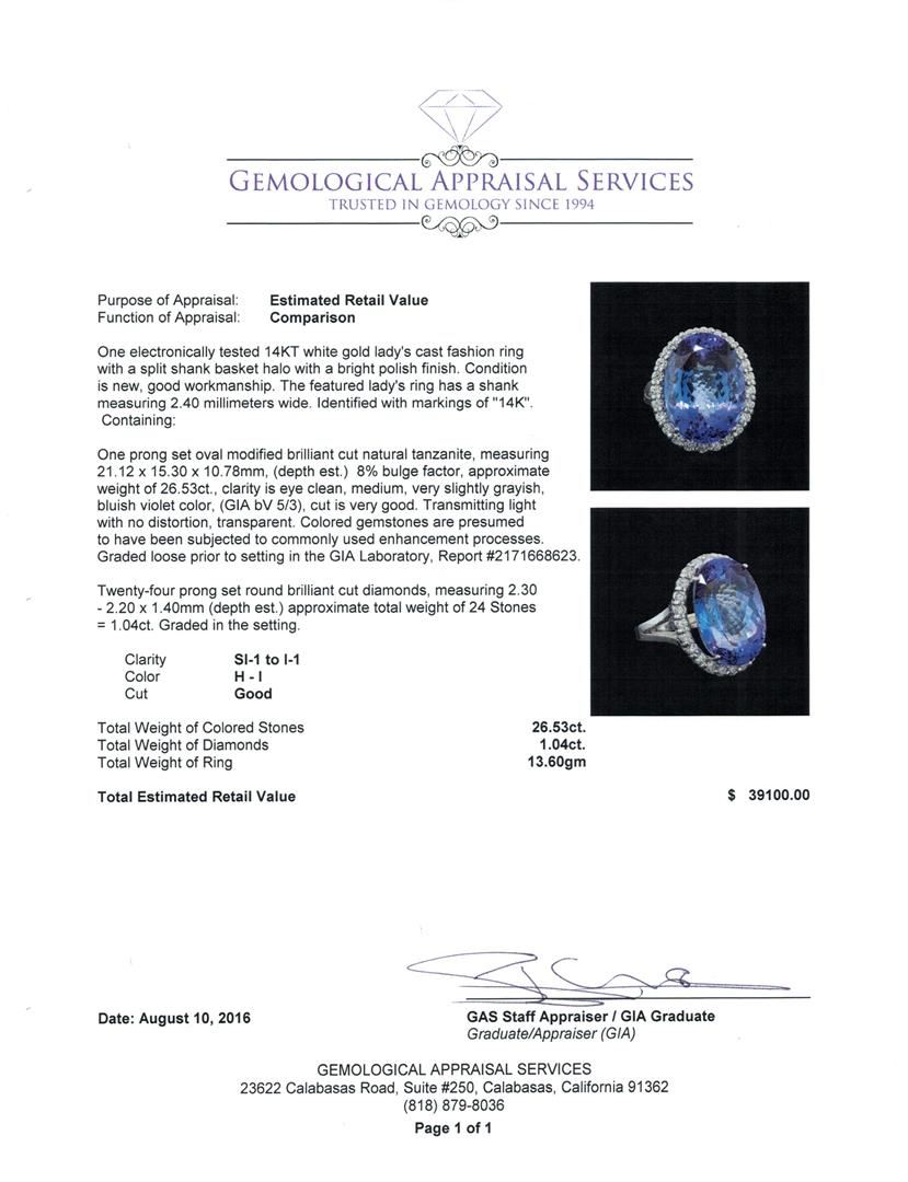 One electronically tested 14KT white gold lady's cast fashion ring with a split shank basket halo with a bright polish finish. The featured lady's ring has a shank measuring 2.40 millimeters wide. Identified with markings of '14K'. Condition is new, good workmanship. Containing: One prong set oval modified brilliant cut natural tanzanite, measuring 21.12 x 15.30 x 10.78mm, (depth est.) 8%. bulge factor, approximate weight of 26.53ct., clarity is eye clean, medium, very slightly grayish, bluish violet color, (GIA bV 5/3), cut is very good. Transmitting light with no distortion, transparent. Colored gemstones are presumed to have been subjected to commonly used enhancement processes. Graded loose prior to setting in the GIA Laboratory, Report #2171668623. Twenty-Four prong set round brilliant cut diamonds, measuring 2.30 - 2.20 x 1.40mm (depth est.) approximate total weight of 24 Stones = 1.04ct. Graded in the setting. Clarity SI-1 to I-1. Color: H - I Cut Good. Total Weight of Colored Stones 26.53ct.. Total Weight of Diamonds 1.04ct.. Total Weight of Ring 13.60gm. GAS Appraised at $39,100.00.