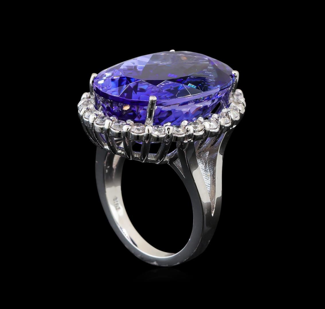 One electronically tested 14KT white gold lady's cast fashion ring with a split shank basket halo with a bright polish finish. The featured lady's ring has a shank measuring 2.40 millimeters wide. Identified with markings of '14K'. Condition is new, good workmanship. Containing: One prong set oval modified brilliant cut natural tanzanite, measuring 21.12 x 15.30 x 10.78mm, (depth est.) 8%. bulge factor, approximate weight of 26.53ct., clarity is eye clean, medium, very slightly grayish, bluish violet color, (GIA bV 5/3), cut is very good. Transmitting light with no distortion, transparent. Colored gemstones are presumed to have been subjected to commonly used enhancement processes. Graded loose prior to setting in the GIA Laboratory, Report #2171668623. Twenty-Four prong set round brilliant cut diamonds, measuring 2.30 - 2.20 x 1.40mm (depth est.) approximate total weight of 24 Stones = 1.04ct. Graded in the setting. Clarity SI-1 to I-1. Color: H - I Cut Good. Total Weight of Colored Stones 26.53ct.. Total Weight of Diamonds 1.04ct.. Total Weight of Ring 13.60gm. GAS Appraised at $39,100.00.