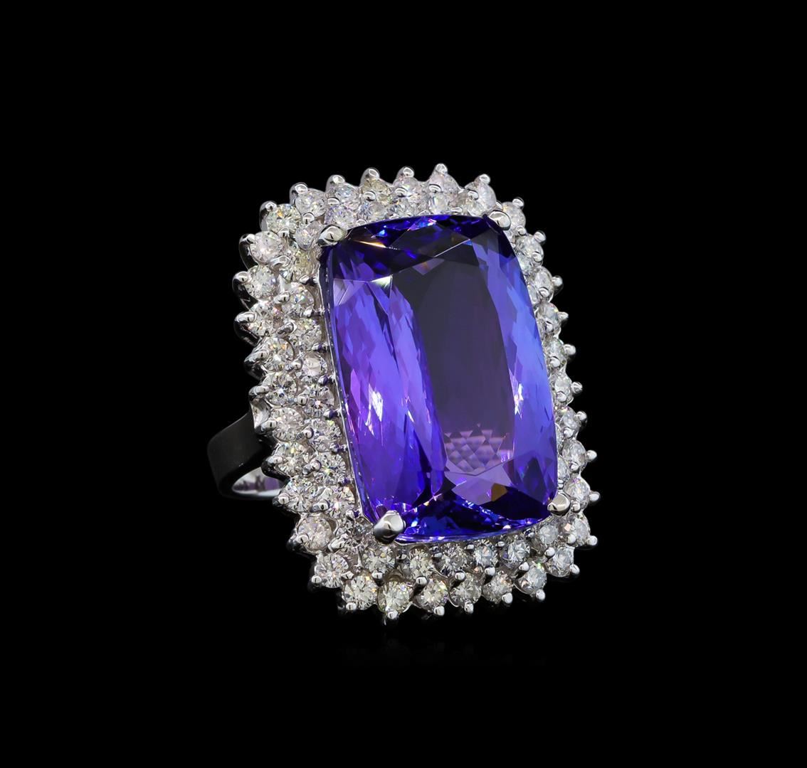 One electronically tested 14KT white gold lady's cast fashion ring with a double basket halo with a bright polish finish. The featured lady's ring has a shank measuring 3.28 millimeters wide. Identified with markings of 'K14'. Condition is new, good workmanship. Containing: One prong set rectangular cushion modified brilliant cut natural tanzanite, measuring 22.08 x 14.61 x 9.16mm, (depth est.) 15%. bulge factor, approximate weight of 26.67ct., clarity is eye clean, medium, moderately strong, violet color, (GIA V 5/4), cut is very good. Transmitting light with no distortion, transparent. Colored gemstones are presumed to have been subjected to commonly used enhancement processes. Graded loose prior to setting in the GIA Laboratory, Report #2175668749. Sixty-Four prong set round brilliant cut diamonds, measuring 2.30 - 2.20 x 1.37mm (depth est.) approximate total weight of 64 Stones = 2.70ct. Graded in the setting. Clarity SI-1 to I-1. Color: G - I Cut Good. Total Weight of Colored Stones 26.67ct.. Total Weight of Diamonds 2.70ct.. Total Weight of Ring 18.80gm. GAS Appraised at $43,125.00.