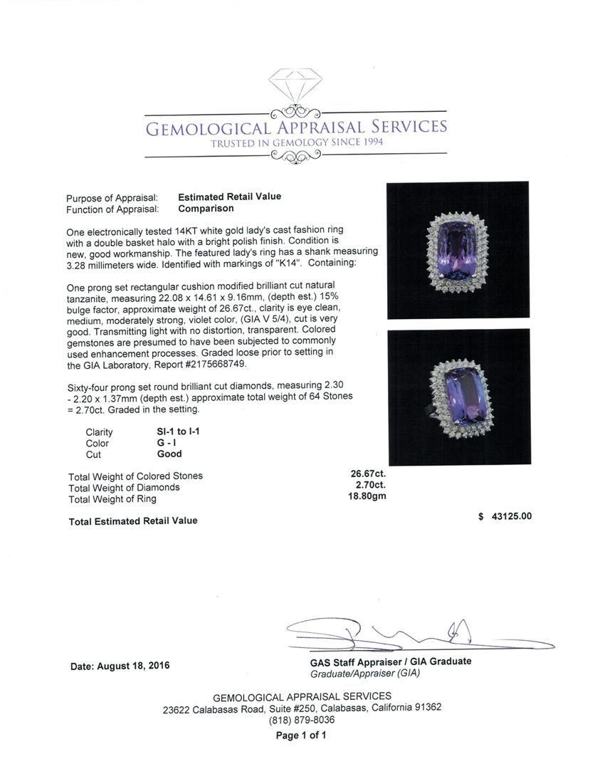 One electronically tested 14KT white gold lady's cast fashion ring with a double basket halo with a bright polish finish. The featured lady's ring has a shank measuring 3.28 millimeters wide. Identified with markings of 'K14'. Condition is new, good workmanship. Containing: One prong set rectangular cushion modified brilliant cut natural tanzanite, measuring 22.08 x 14.61 x 9.16mm, (depth est.) 15%. bulge factor, approximate weight of 26.67ct., clarity is eye clean, medium, moderately strong, violet color, (GIA V 5/4), cut is very good. Transmitting light with no distortion, transparent. Colored gemstones are presumed to have been subjected to commonly used enhancement processes. Graded loose prior to setting in the GIA Laboratory, Report #2175668749. Sixty-Four prong set round brilliant cut diamonds, measuring 2.30 - 2.20 x 1.37mm (depth est.) approximate total weight of 64 Stones = 2.70ct. Graded in the setting. Clarity SI-1 to I-1. Color: G - I Cut Good. Total Weight of Colored Stones 26.67ct.. Total Weight of Diamonds 2.70ct.. Total Weight of Ring 18.80gm. GAS Appraised at $43,125.00.