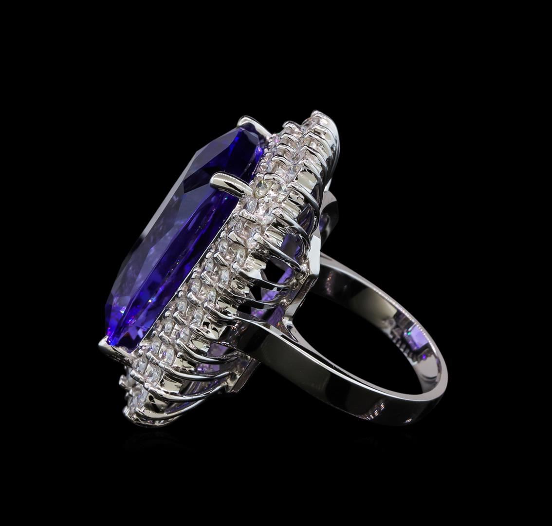 One electronically tested 14KT white gold lady's cast fashion ring with a double basket halo with a bright polish finish. The featured lady's ring has a shank measuring 3.28 millimeters wide. Identified with markings of 'K14'. Condition is new, good workmanship. Containing: One prong set rectangular cushion modified brilliant cut natural tanzanite, measuring 22.08 x 14.61 x 9.16mm, (depth est.) 15%. bulge factor, approximate weight of 26.67ct., clarity is eye clean, medium, moderately strong, violet color, (GIA V 5/4), cut is very good. Transmitting light with no distortion, transparent. Colored gemstones are presumed to have been subjected to commonly used enhancement processes. Graded loose prior to setting in the GIA Laboratory, Report #2175668749. Sixty-Four prong set round brilliant cut diamonds, measuring 2.30 - 2.20 x 1.37mm (depth est.) approximate total weight of 64 Stones = 2.70ct. Graded in the setting. Clarity SI-1 to I-1. Color: G - I Cut Good. Total Weight of Colored Stones 26.67ct.. Total Weight of Diamonds 2.70ct.. Total Weight of Ring 18.80gm. GAS Appraised at $43,125.00.
