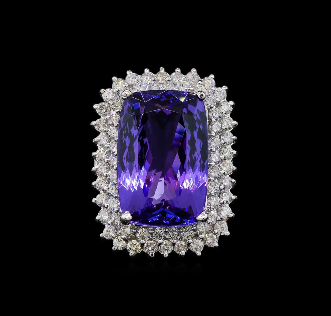 One electronically tested 14KT white gold lady's cast fashion ring with a double basket halo with a bright polish finish. The featured lady's ring has a shank measuring 3.28 millimeters wide. Identified with markings of 'K14'. Condition is new, good workmanship. Containing: One prong set rectangular cushion modified brilliant cut natural tanzanite, measuring 22.08 x 14.61 x 9.16mm, (depth est.) 15%. bulge factor, approximate weight of 26.67ct., clarity is eye clean, medium, moderately strong, violet color, (GIA V 5/4), cut is very good. Transmitting light with no distortion, transparent. Colored gemstones are presumed to have been subjected to commonly used enhancement processes. Graded loose prior to setting in the GIA Laboratory, Report #2175668749. Sixty-Four prong set round brilliant cut diamonds, measuring 2.30 - 2.20 x 1.37mm (depth est.) approximate total weight of 64 Stones = 2.70ct. Graded in the setting. Clarity SI-1 to I-1. Color: G - I Cut Good. Total Weight of Colored Stones 26.67ct.. Total Weight of Diamonds 2.70ct.. Total Weight of Ring 18.80gm. GAS Appraised at $43,125.00.