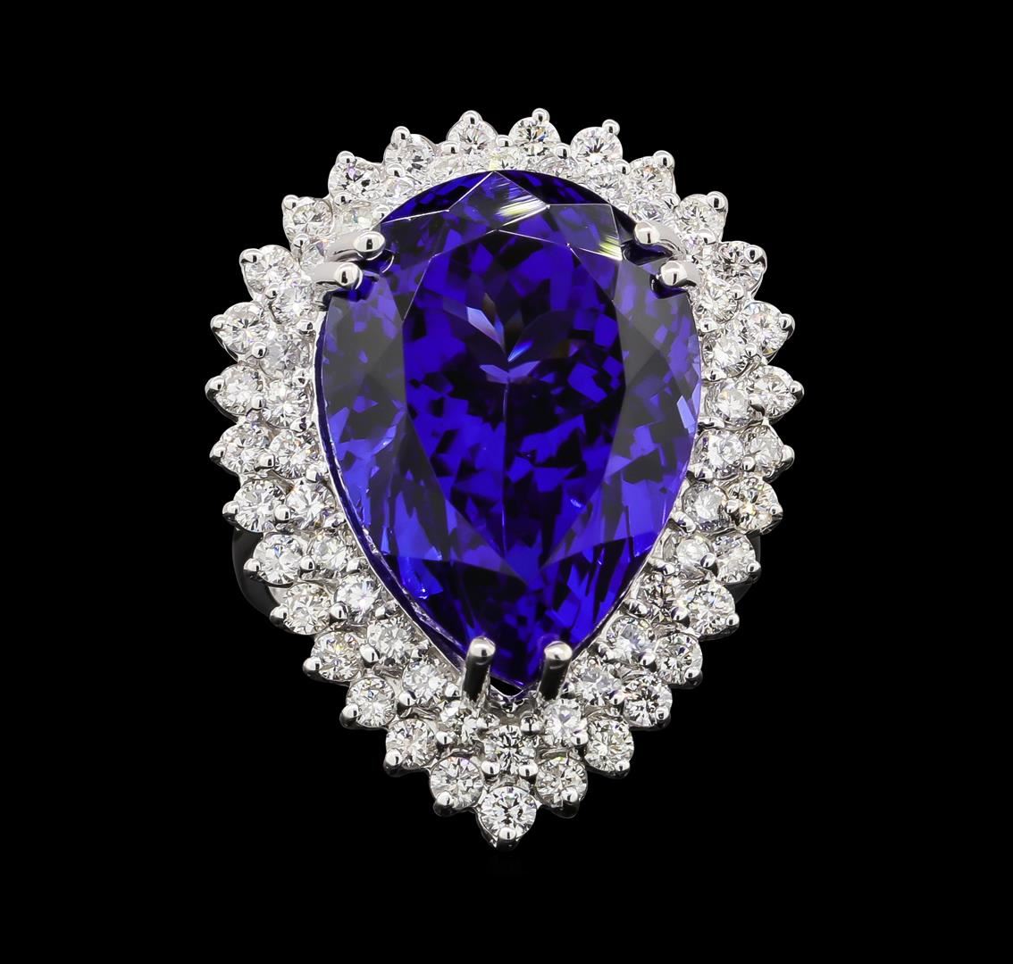 One electronically tested 14KT white gold lady's cast fashion ring with a double basket halo with a bright polish finish. The featured lady's ring has a shank measuring 2.51 millimeters wide. Identified with markings of 'K14'. Condition is new, good workmanship. Containing: One prong set pear modified brilliant cut natural tanzanite, measuring 20.39 x 14.39 x 12.88mm, (depth est.) 9%. bulge factor, approximate weight of 27.51ct., clarity is eye clean, dark, strong, violetish blue color, (GIA vB 7/5), cut is very good. Transmitting light with no distortion, transparent. Colored gemstones are presumed to have been subjected to commonly used enhancement processes. Graded loose prior to setting in the GIA Laboratory, Report #1172847820. Sixty-One prong set round brilliant cut diamonds, measuring 2.00 - 1.90 x 1.21mm (depth est.) approximate total weight of 61 Stones = 1.75ct. Graded in the setting. Clarity SI-1 to SI-2. Color: H - I Cut Good. Total Weight of Colored Stones 27.51ct.. Total Weight of Diamonds 1.75ct.. Total Weight of Ring 13.80gm. GAS Appraised at $41,775.00.