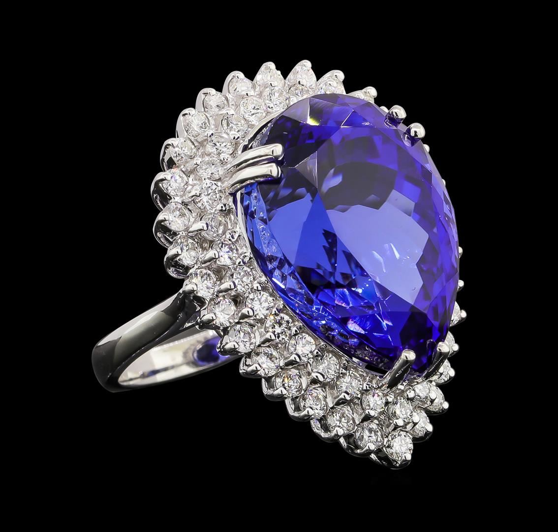 One electronically tested 14KT white gold lady's cast fashion ring with a double basket halo with a bright polish finish. The featured lady's ring has a shank measuring 2.51 millimeters wide. Identified with markings of 'K14'. Condition is new, good workmanship. Containing: One prong set pear modified brilliant cut natural tanzanite, measuring 20.39 x 14.39 x 12.88mm, (depth est.) 9%. bulge factor, approximate weight of 27.51ct., clarity is eye clean, dark, strong, violetish blue color, (GIA vB 7/5), cut is very good. Transmitting light with no distortion, transparent. Colored gemstones are presumed to have been subjected to commonly used enhancement processes. Graded loose prior to setting in the GIA Laboratory, Report #1172847820. Sixty-One prong set round brilliant cut diamonds, measuring 2.00 - 1.90 x 1.21mm (depth est.) approximate total weight of 61 Stones = 1.75ct. Graded in the setting. Clarity SI-1 to SI-2. Color: H - I Cut Good. Total Weight of Colored Stones 27.51ct.. Total Weight of Diamonds 1.75ct.. Total Weight of Ring 13.80gm. GAS Appraised at $41,775.00.