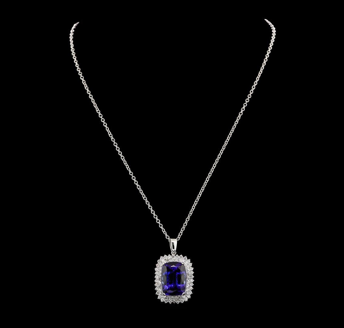 One electronically tested 14KT white gold lady's combination cast & assembled fashion pendant & chain 20.0' long, 2.3mm round cable link with a lobster claw clasp with a double basket halo with a bright polish finish. Identified with markings of '14K'. Condition is new, good workmanship. Containing: One prong set rectangular cushion modified brilliant cut natural tanzanite, measuring 19.79 x 14.90 x 11.21mm, (depth est.) 9%. bulge factor, approximate weight of 28.33ct., clarity is eye clean, medium, very slightly grayish, bluish violet color, (GIA bV 5/3), cut is very good. Transmitting light with no distortion, transparent. Colored gemstones are presumed to have been subjected to commonly used enhancement processes. Graded loose prior to setting in the GIA Laboratory, Report #2175847419. Sixty-Four prong set round brilliant cut diamonds, measuring 2.30 - 2.20 x 1.40mm (depth est.) approximate total weight of 64 Stones = 2.81ct. Graded in the setting. Clarity SI-1 to SI-2. Color: H - I Cut Good. Total Weight of Colored Stones 28.33ct.. Total Weight of Diamonds 2.81ct.. Total Weight of Pendant & Chain 19.20gm. GAS Appraised at $38,270.00.