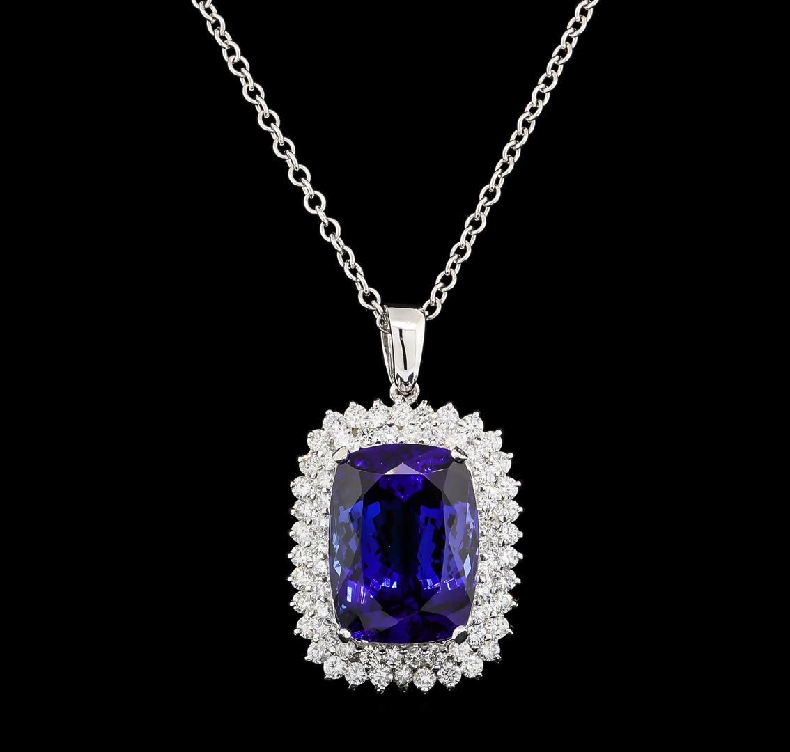 One electronically tested 14KT white gold lady's combination cast & assembled fashion pendant & chain 20.0' long, 2.3mm round cable link with a lobster claw clasp with a double basket halo with a bright polish finish. Identified with markings of '14K'. Condition is new, good workmanship. Containing: One prong set rectangular cushion modified brilliant cut natural tanzanite, measuring 19.79 x 14.90 x 11.21mm, (depth est.) 9%. bulge factor, approximate weight of 28.33ct., clarity is eye clean, medium, very slightly grayish, bluish violet color, (GIA bV 5/3), cut is very good. Transmitting light with no distortion, transparent. Colored gemstones are presumed to have been subjected to commonly used enhancement processes. Graded loose prior to setting in the GIA Laboratory, Report #2175847419. Sixty-Four prong set round brilliant cut diamonds, measuring 2.30 - 2.20 x 1.40mm (depth est.) approximate total weight of 64 Stones = 2.81ct. Graded in the setting. Clarity SI-1 to SI-2. Color: H - I Cut Good. Total Weight of Colored Stones 28.33ct.. Total Weight of Diamonds 2.81ct.. Total Weight of Pendant & Chain 19.20gm. GAS Appraised at $38,270.00.
