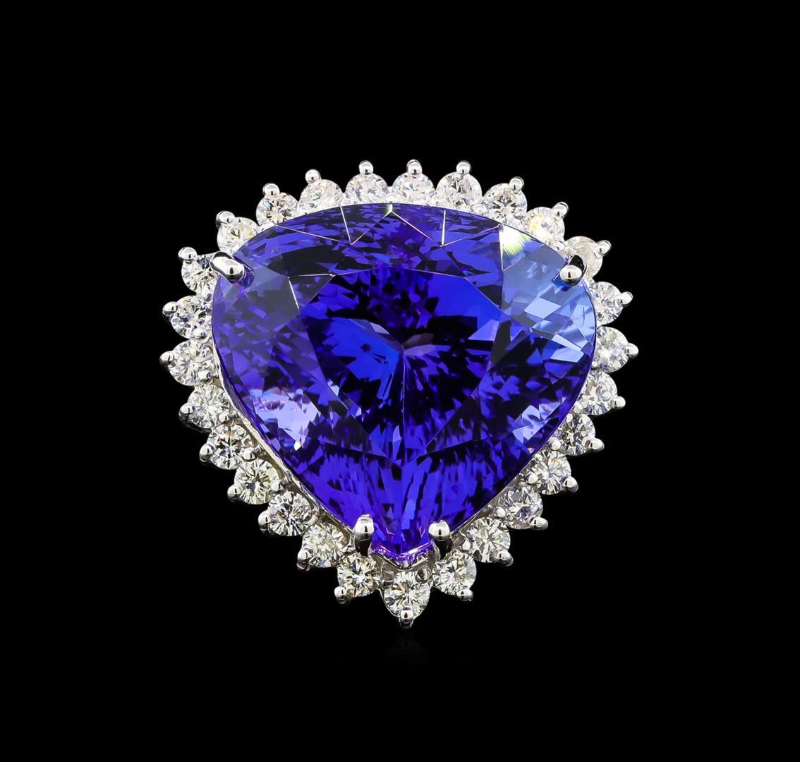 One electronically tested 14KT white gold lady's cast fashion ring with a basket halo with a bright polish finish. The featured lady's ring has a shank measuring 3.09 millimeters wide. Identified with markings of 'K14'. Condition is new, good workmanship. Containing: One prong set pear modified brilliant cut natural tanzanite, measuring 17.90 x 19.45 x 13.79mm, (depth est.) approximate weight of 28.94ct., clarity is eye clean, medium dark, strong, violet color, (GIA V 6/5), cut is very good. Transmitting light with no distortion, transparent. Colored gemstones are presumed to have been subjected to commonly used enhancement processes. Graded loose prior to setting in the GIA Laboratory, Report #2175668631. Twenty-Seven prong set round brilliant cut diamonds, measuring 2.35 - 2.25 x 1.43mm (depth est.) approximate total weight of 27 Stones = 1.25ct. Graded in the setting. Clarity SI-1 to I-1. Color: G - I Cut Good. Total Weight of Colored Stones 28.94ct.. Total Weight of Diamonds 1.25ct.. Total Weight of Ring 13.20gm. GAS Appraised at $39,115.00.
