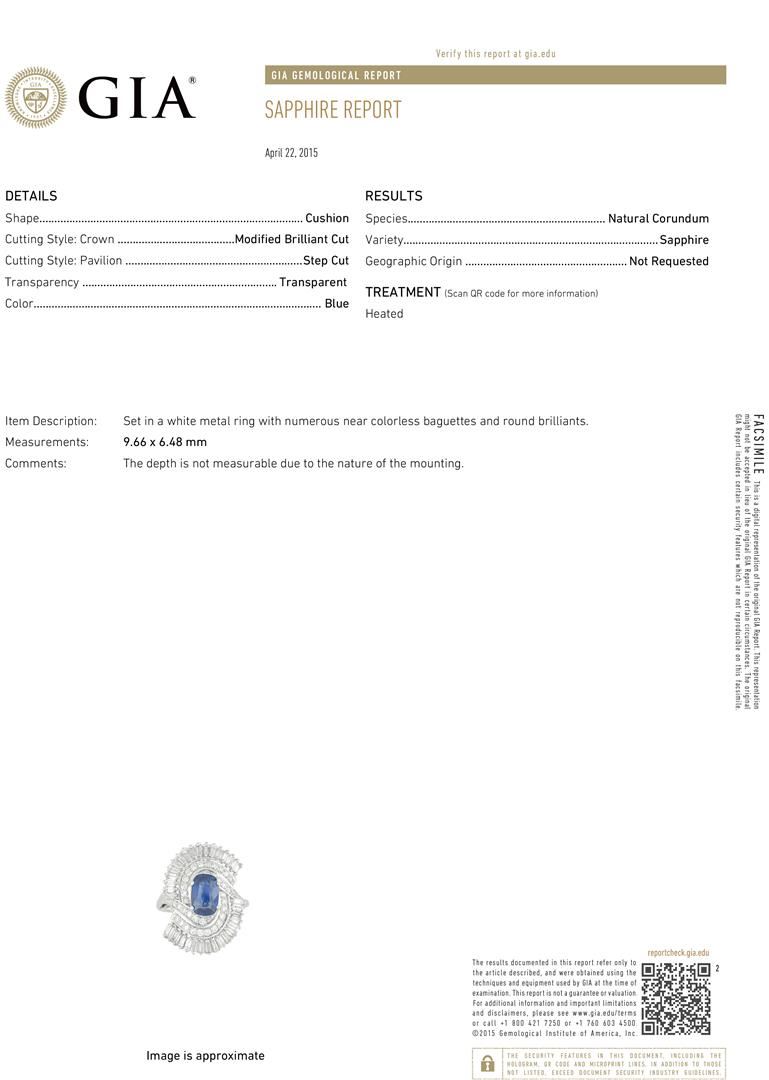 One electronically tested 14KT white gold lady's cast fashion ring with a bypass swirl halo with a bright polish finish. The featured lady's ring has a shank measuring 1.80 millimeters wide. Identified with markings of '14K'. Condition is new, good workmanship. Containing: One prong set rectangular cushion modified mixed cut natural blue sapphire, measuring 9.66 x 6.48 x 4.54mm, (depth est.) 14%. bulge factor, approximate weight of 3.03ct., clarity is eye clean, medium dark, strong, blue color, (GIA B 6/5), cut is very good. Transmitting light with no distortion, transparent. Colored gemstones are presumed to have been subjected to commonly used enhancement processes. Graded in the setting. GIA Report #1176111428. Thirty-Four prong set baguette cut diamonds, measuring from 3.10 x 1.50 x 1.28mm (depth est.) to 3.20 x 1.70 x 1.45mm (depth est.) approximate total weight of 34 Stones = 2.18ct. Graded in the setting. Clarity VS-2 to SI-2. Color: G - H Cut Good Thirty-Six prong set round brilliant cut diamonds, measuring 1.70 - 1.60 x 0.99mm (depth est.) approximate total weight of 36 Stones = 0.59ct. Graded in the setting. Clarity SI-1 to SI-2. Color: H - I Cut Good. Total Weight of Colored Stones 3.03ct.. Total Weight of Diamonds 2.77ct.. Total Weight of Ring 11.00gm. GAS Appraised at $36,195.00.